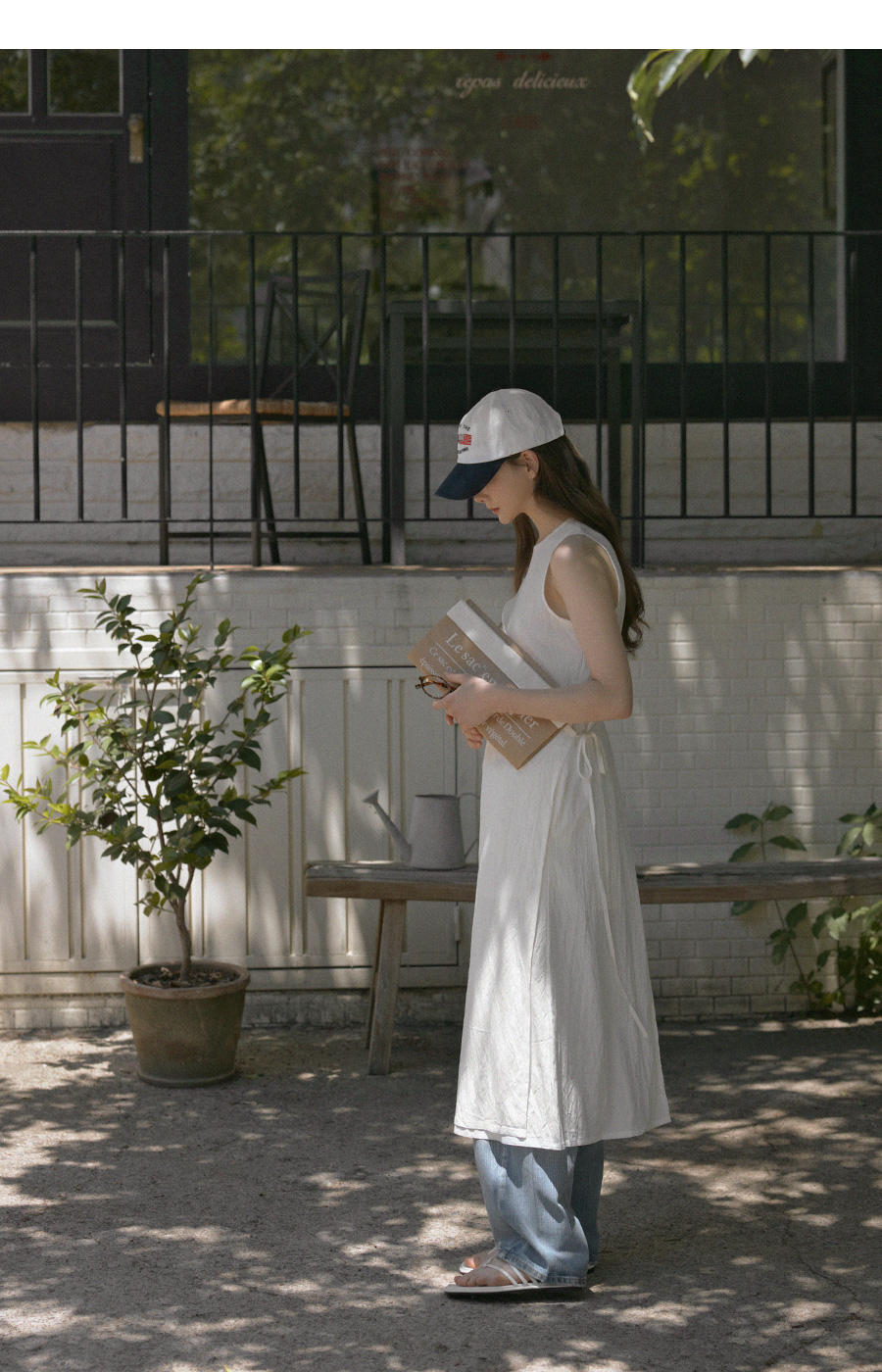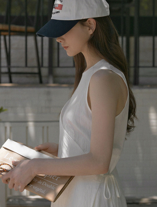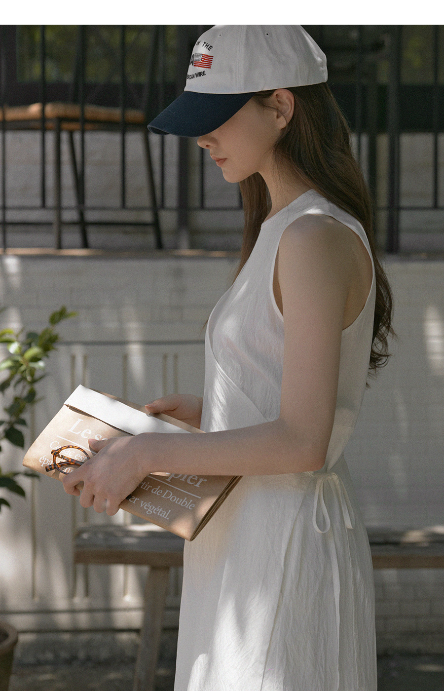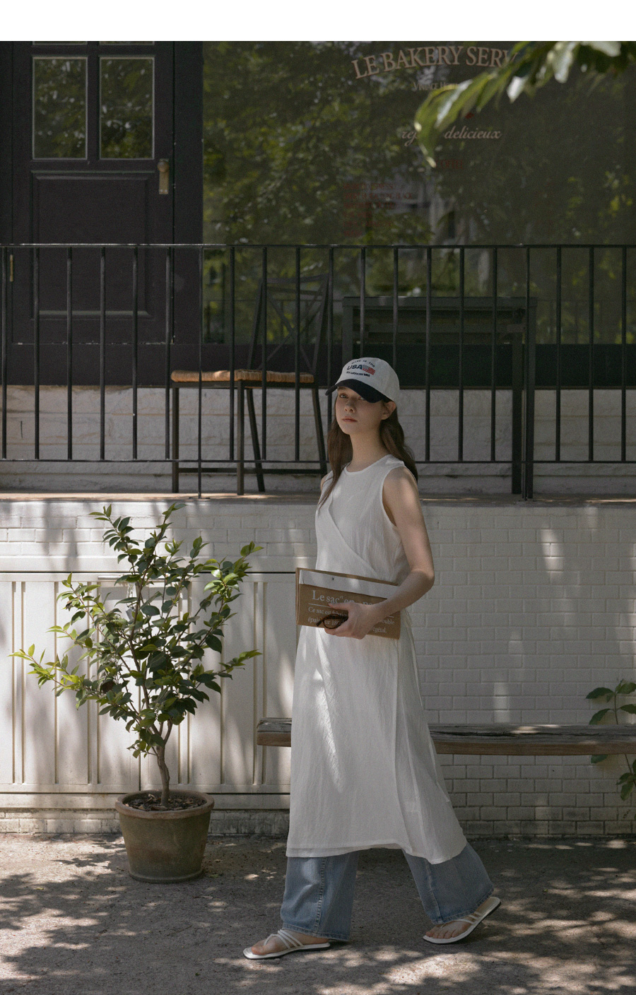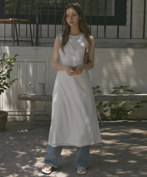 세련된 무드 연출 가능한 슬리브리스 랩 원피스입니다.
