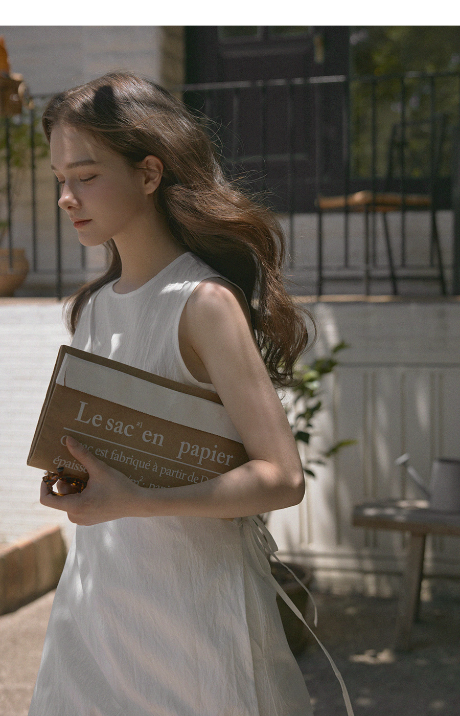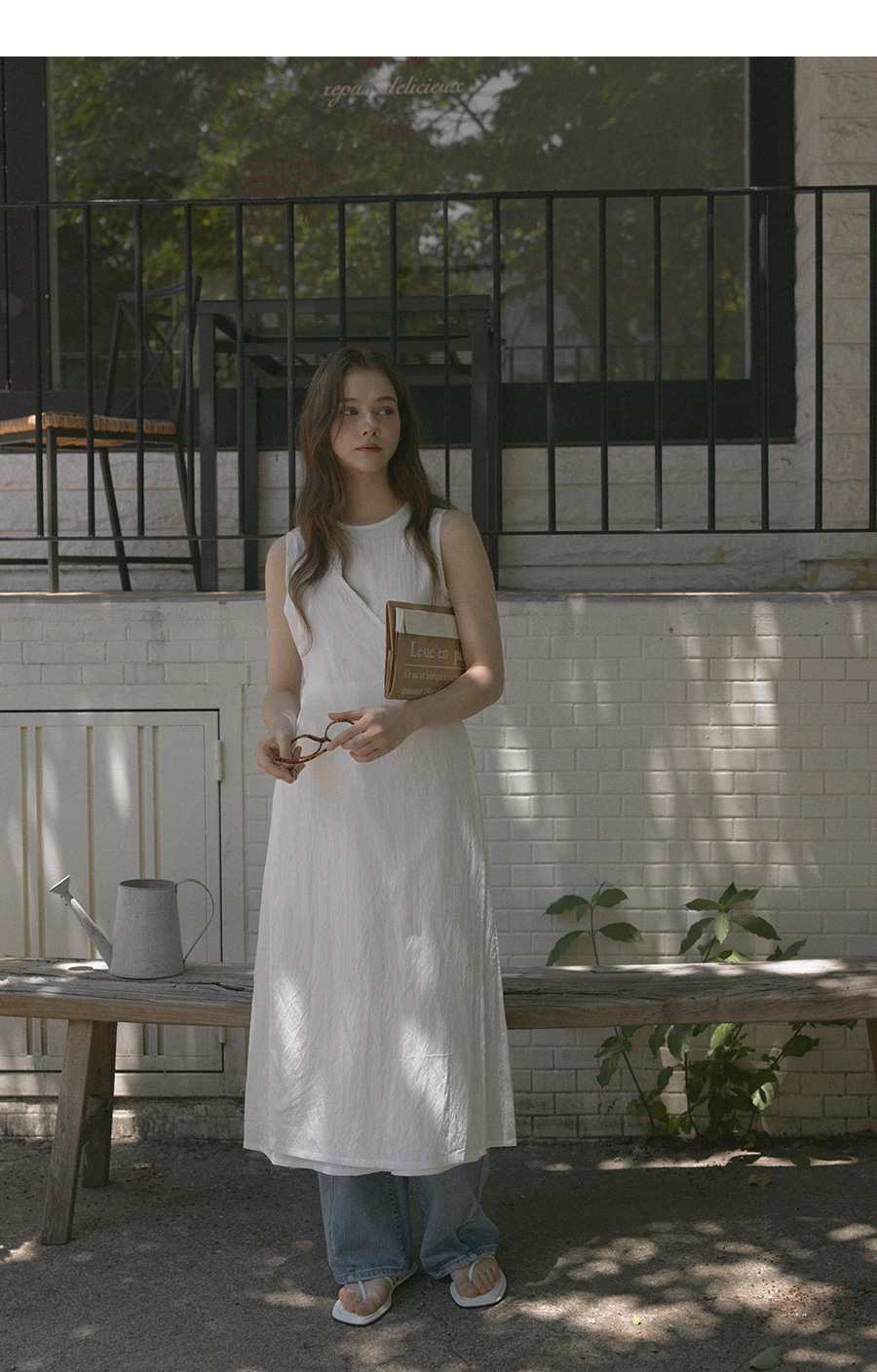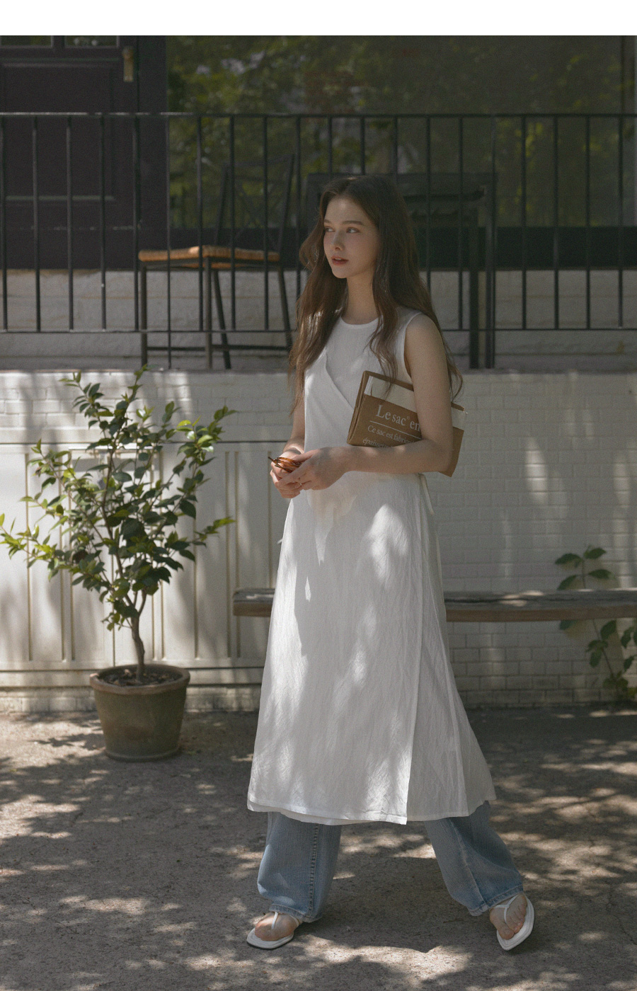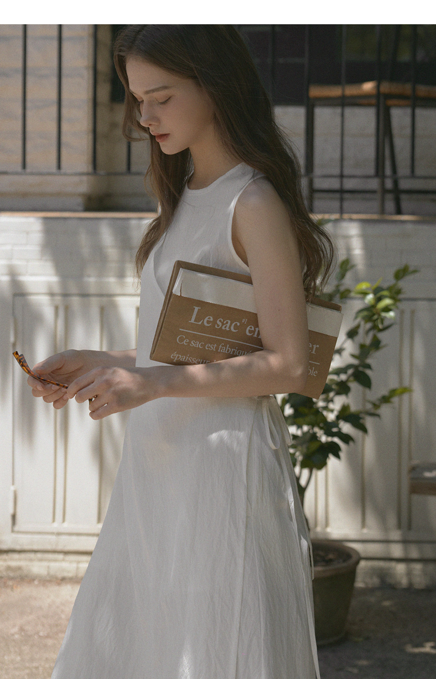 세련된 무드 연출 가능한 슬리브리스 랩 원피스입니다.