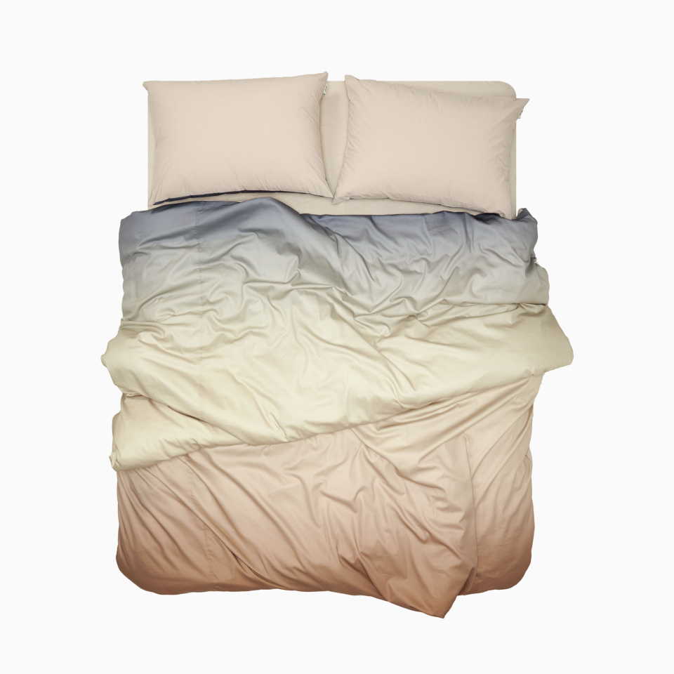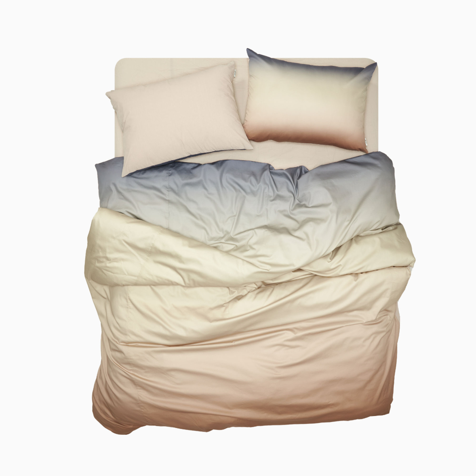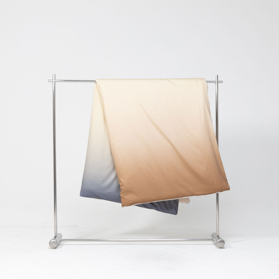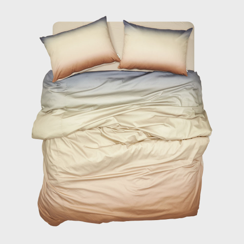 오전 7시의 해가 뜨는 순간을 그라데이션으로 표현한 침구입니다. 해가 뜨기 시작하면서 비추는 금빛 컬러와 여전히 남아있는 새벽녘의 짙은 그레이 빛의 하늘을 담았습니다.
