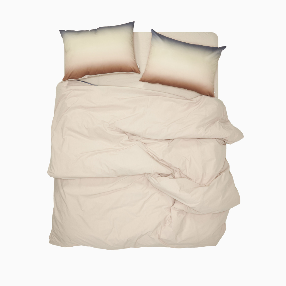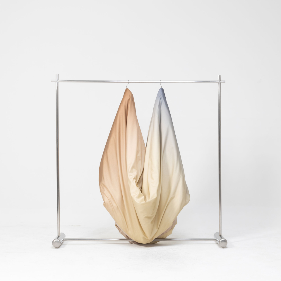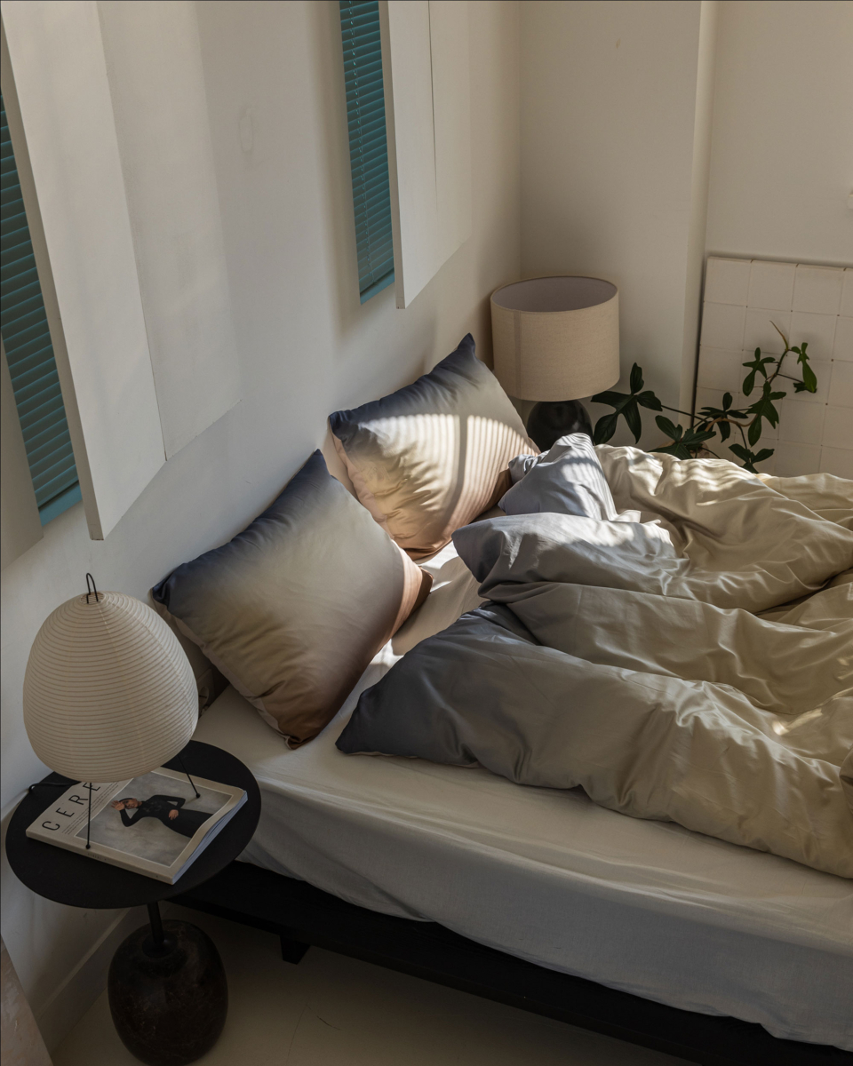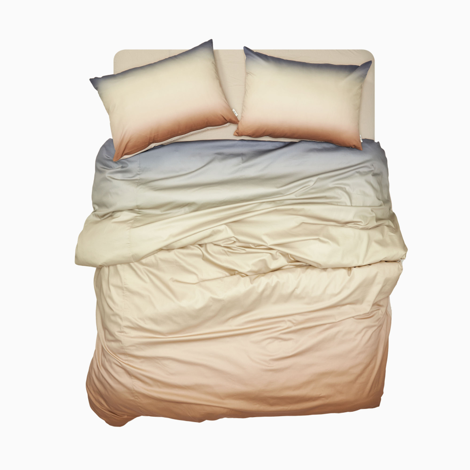 오전 7시의 해가 뜨는 순간을 그라데이션으로 표현한 침구입니다. 해가 뜨기 시작하면서 비추는 금빛 컬러와 여전히 남아있는 새벽녘의 짙은 그레이 빛의 하늘을 담았습니다.