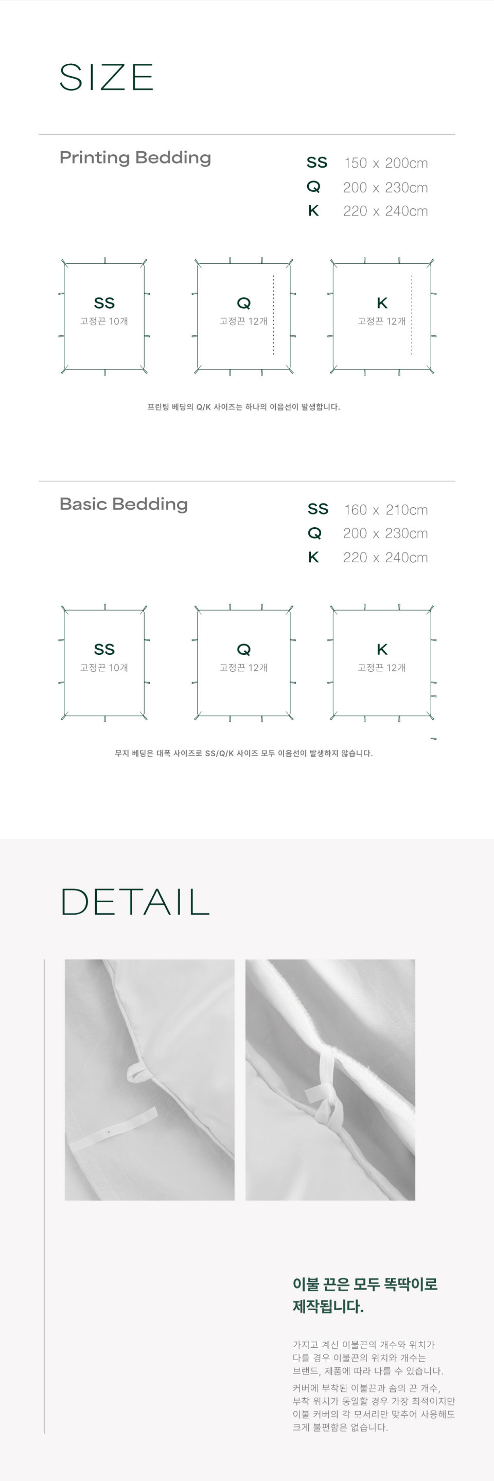 - SS 베딩 세트 : 이불 커버 1 + 베개 커버 1 , Q/K 베딩 세트 : 이불 커버 1 + 베개 커버 2