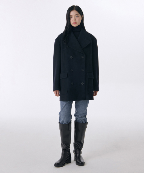 우먼즈 울 블렌드 오버 숄더 피 코트 [네이비]
