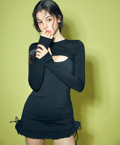 · 힙라인을 덮는 스커트 라인ㆍ과하지 않게 은은한 섹시한 무드를 연출해주는 백스트랩 디테일