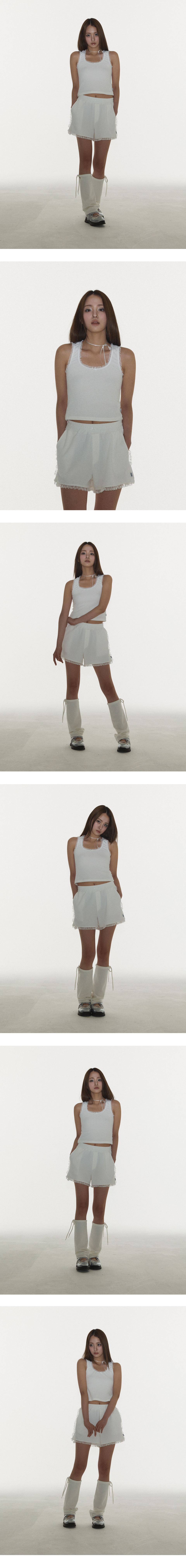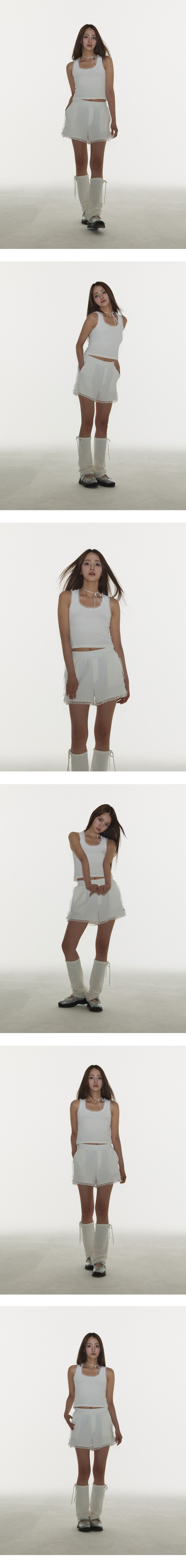 밴딩 쇼츠. 옆트임 쇼츠로 레이스와 리본 장식을 가미 .