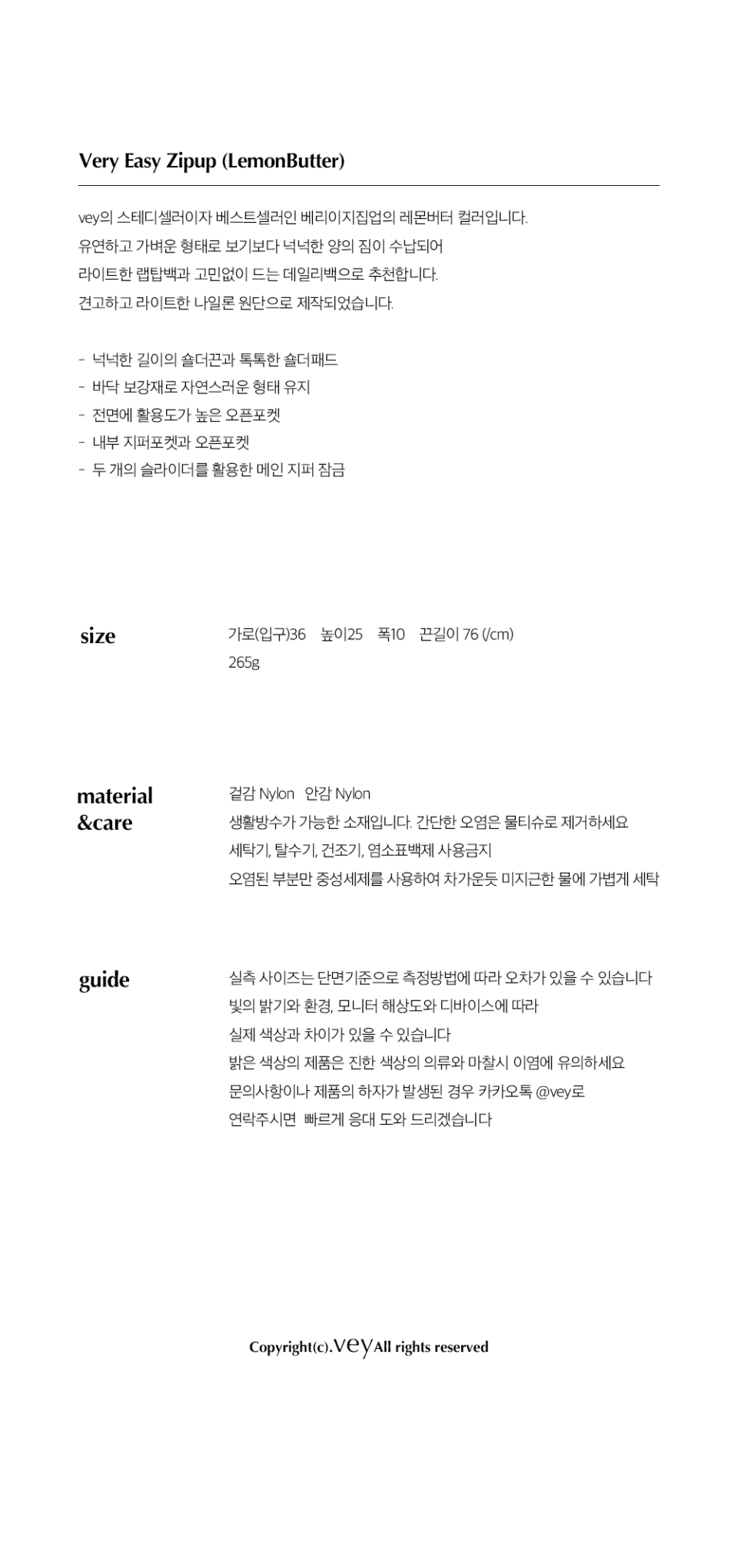 베이(VEY)는 'very easy'를 의미합니다. 새롭고 섬세하면서도 기본에 충실한 가방을 만듭니다. 취향을 기반으로 복장과 상황을 자유롭게 넘나드는 균형감을 지향합니다.