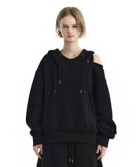 TMB One-Shoulder Raw Cut Set-Up Hoodie [ Black ]