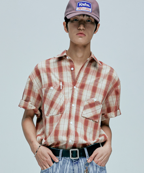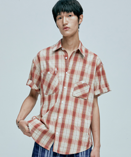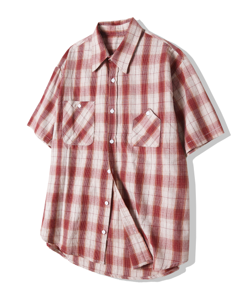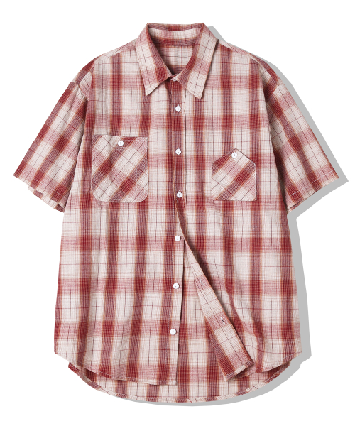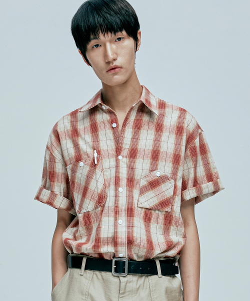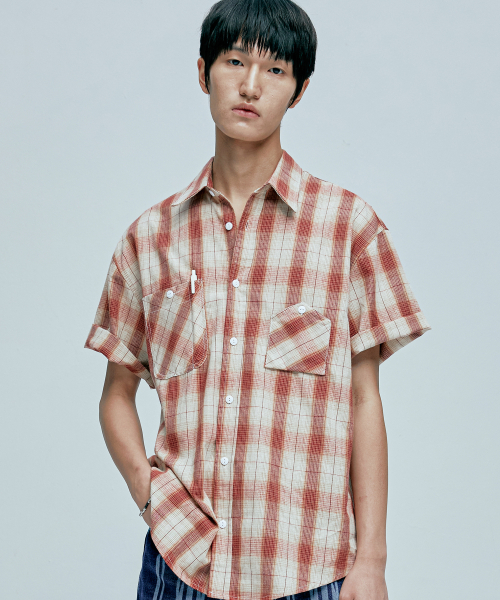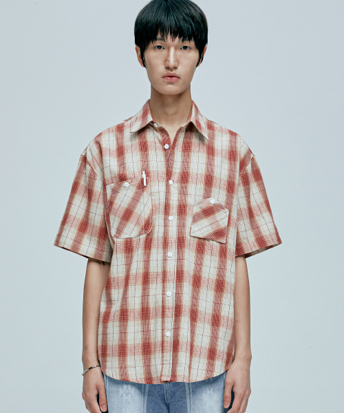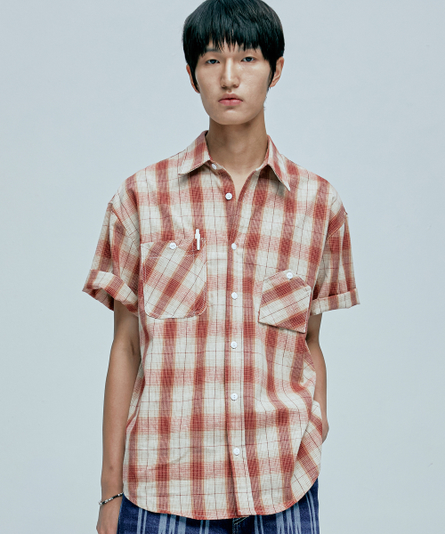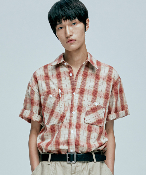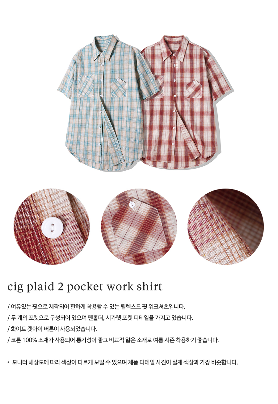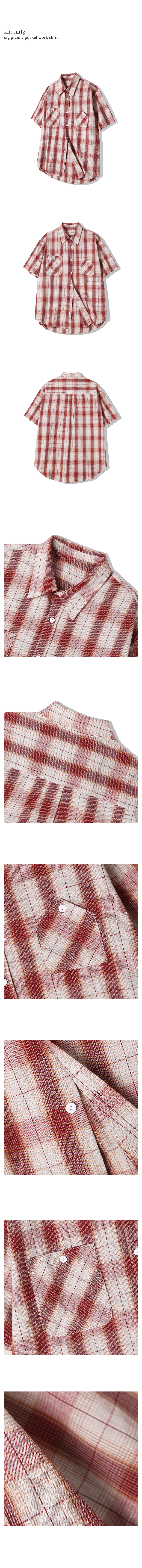cig 플래드 투 포켓 워크 반팔셔츠 레드