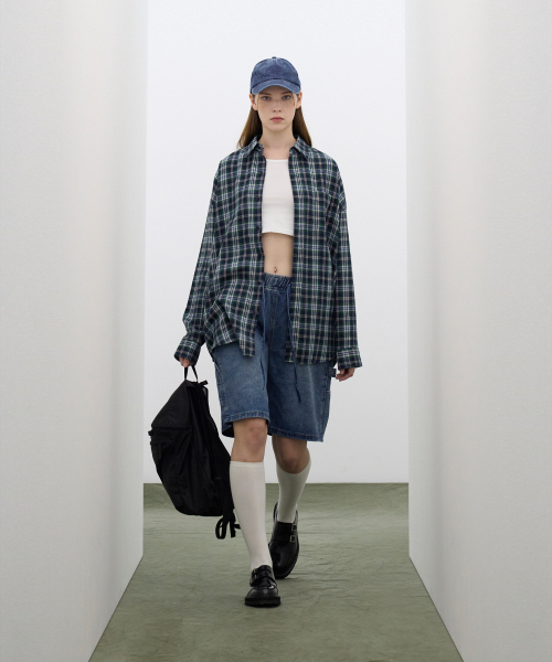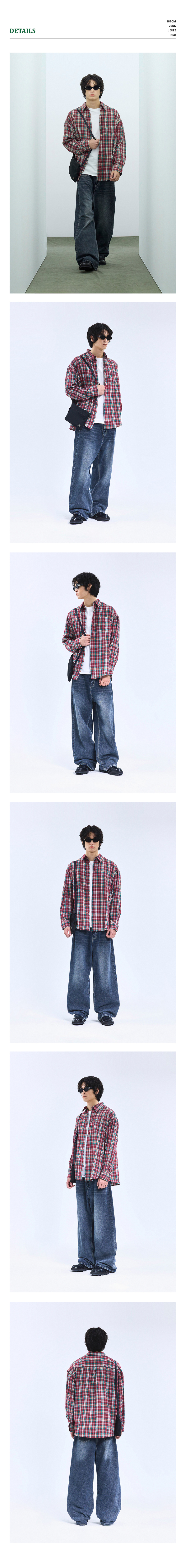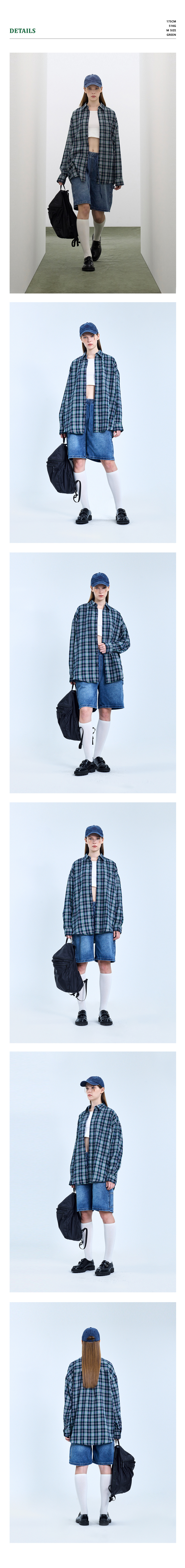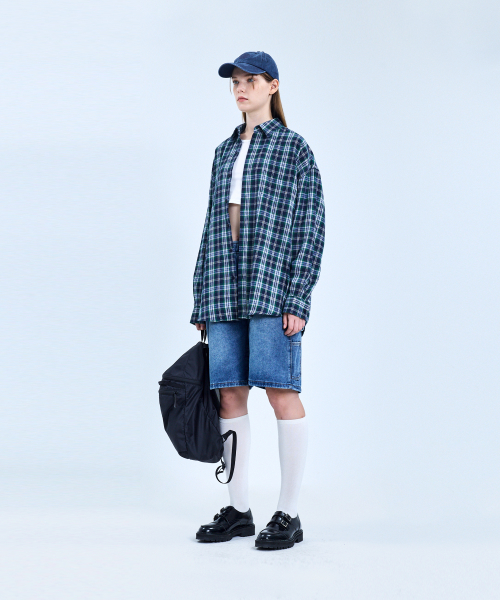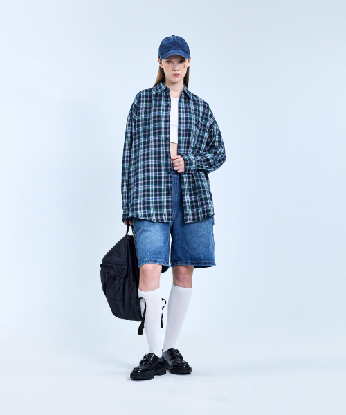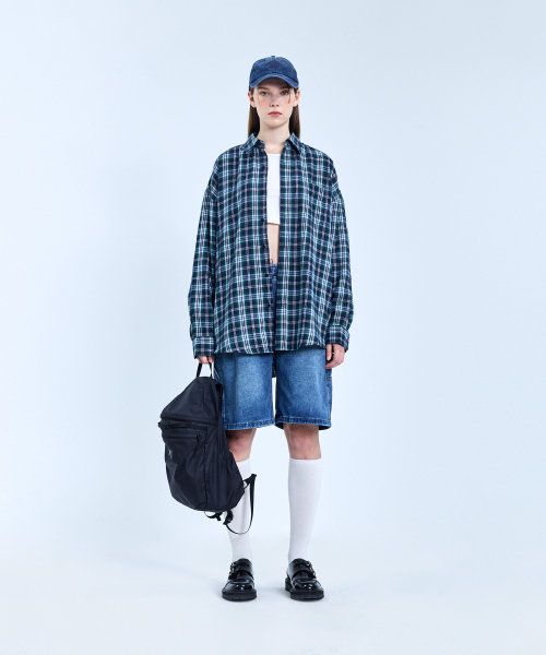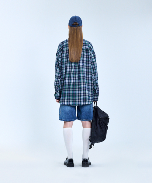 87-STAN135 레트로 긱 오버핏 포켓 긴팔 체크 셔츠 네이비