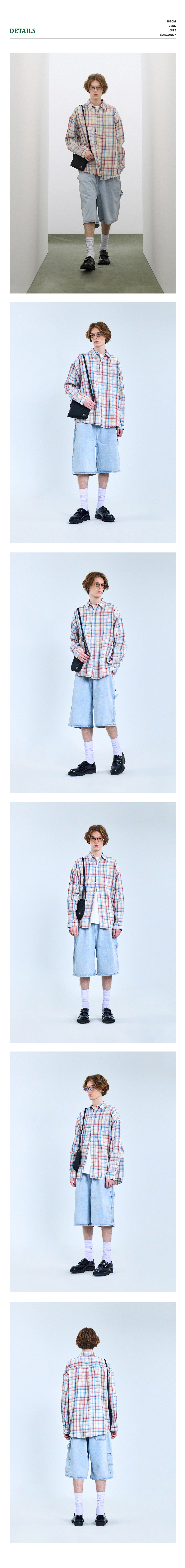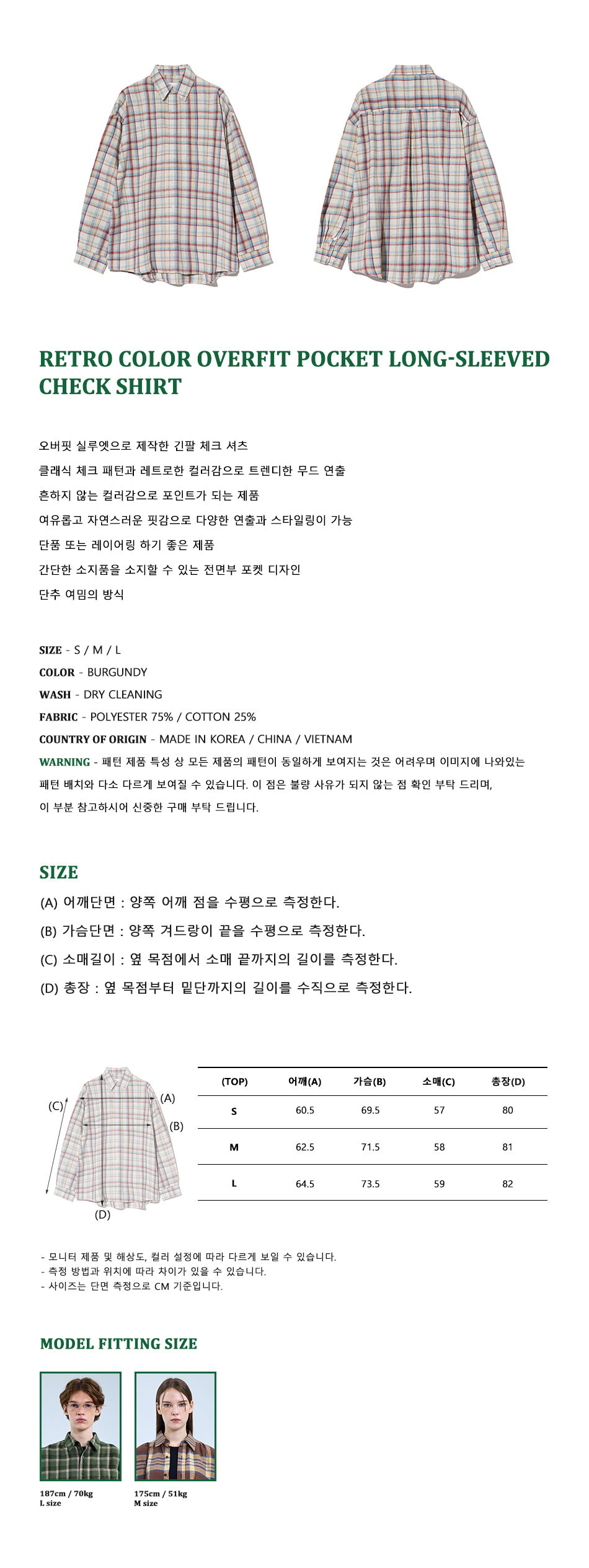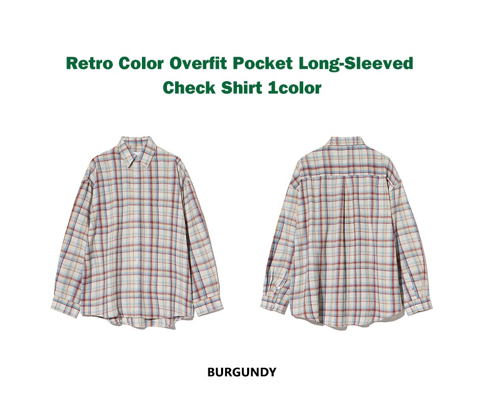 87-STAN090 레트로 컬러 오버핏 포켓 긴팔 체크 셔츠 버건디