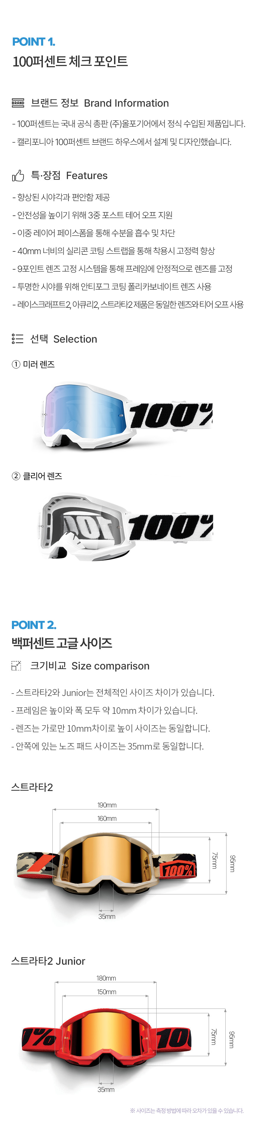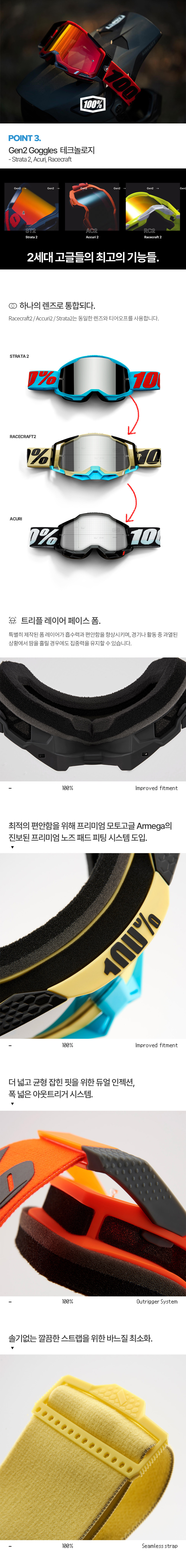 100%(백퍼센트)는 1980년대 초반 LA에서 시작된 이후 모터크로스 분야에서 큰 명성을 얻었습니다. 이후 레이싱 라이딩, 트레일 러닝 등 다양한 스포츠 분야까지 제품군을 폭넓게 확장하여 각 분야 최고의 선수들과 함께 브랜드 가치를 높이고 있습니다.