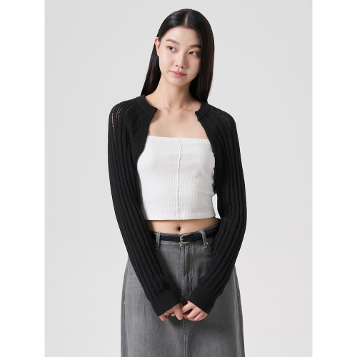 크롭 기장으로 경쾌한 매력이 돋보이는 카디건입니다. 레귤러 핏으로 자연스러운 실루엣을 연출할 수 있습니다. 구멍이 뚫린 스카시 조직으로 멋스러움을 더하였으며 민소매 이너와 함께 매치하면 세련된 분위기를 낼 수 있습니다.