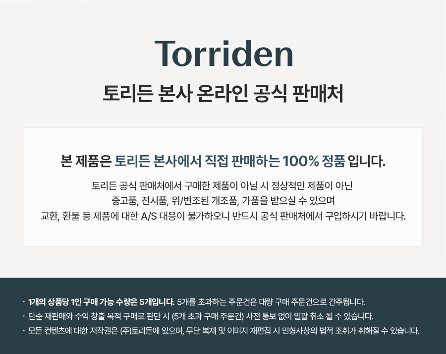 토리든(TORRIDEN)은 'YOUR SKIN IS OUR PLANET'이라는 철학 아래 당신의 피부를 또 하나의 환경과 같이 지키고자 합니다.