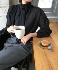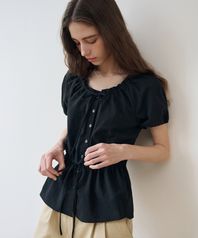 리본 퍼프 슬리브 블라우스 [BLACK]