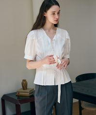 턱 퍼프 반팔 타이 블라우스 [IVORY]