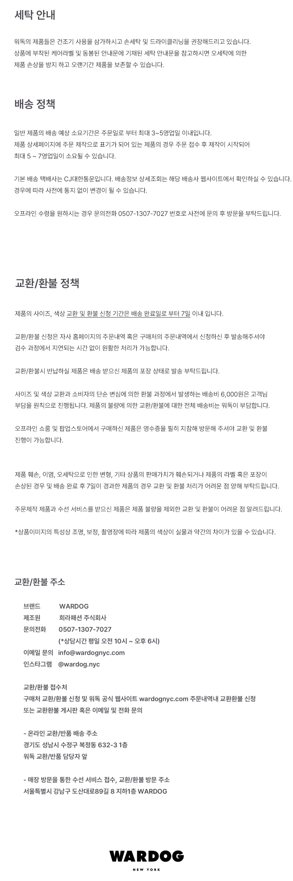 워독(WARDOG)은 뉴욕 펜스테이션의 군견에서 영감을 받아 다채롭고 생동감 넘치는 뉴욕 스트릿 패션을 담아낸 브랜드입니다. 감성적이면서도 힙한 스타일을 추구하며, 비비드한 컬러로 뉴욕의 활기찬 모습을 표현합니다. 워독은 기본에 충실한 클래식한 디자인과 함께 웨어러블하고 편안한 착용감과 뛰어난 핏을 자랑하는 제품만을 생산합니다.
