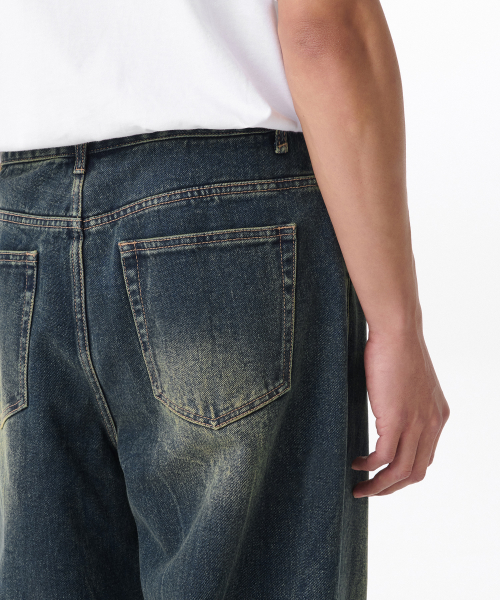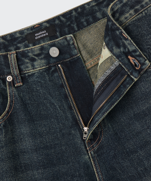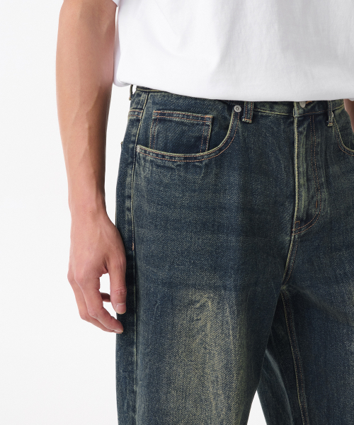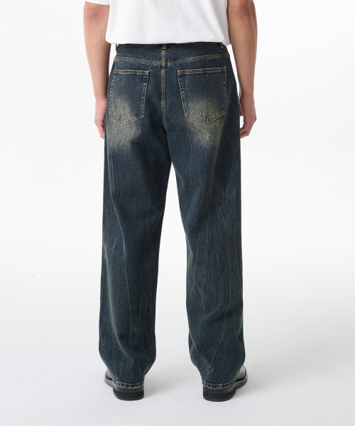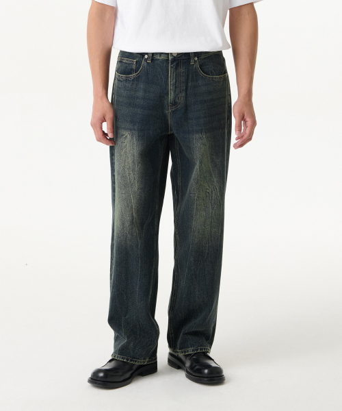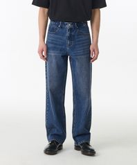 크리즈 워시드 루즈 스트레이트 데님 팬츠 [미디엄 인디고]