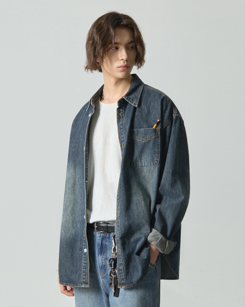 ASI 에센셜 바이오워싱 데님 셔츠_인디고 그레이