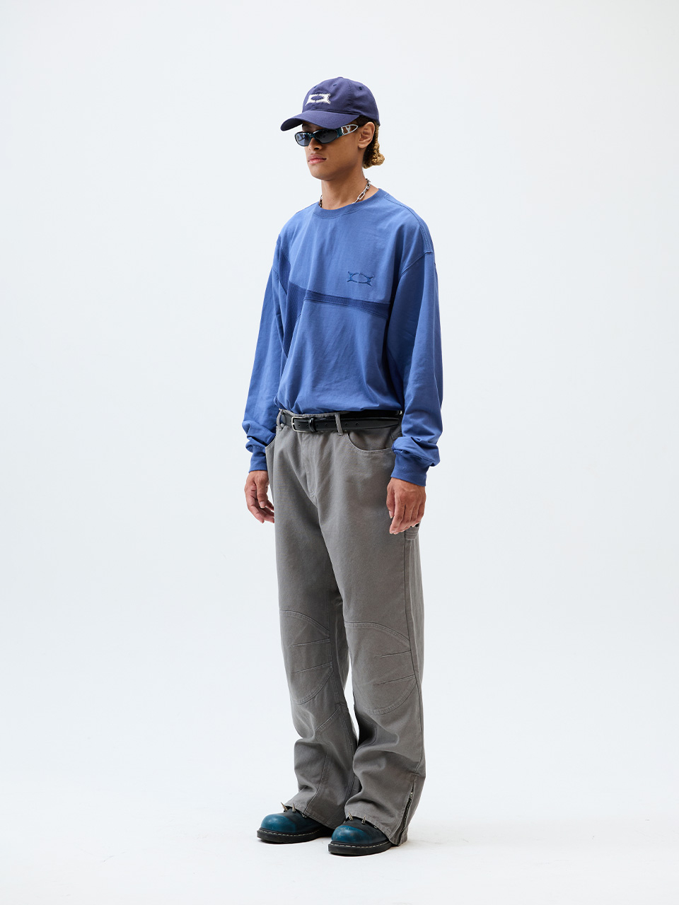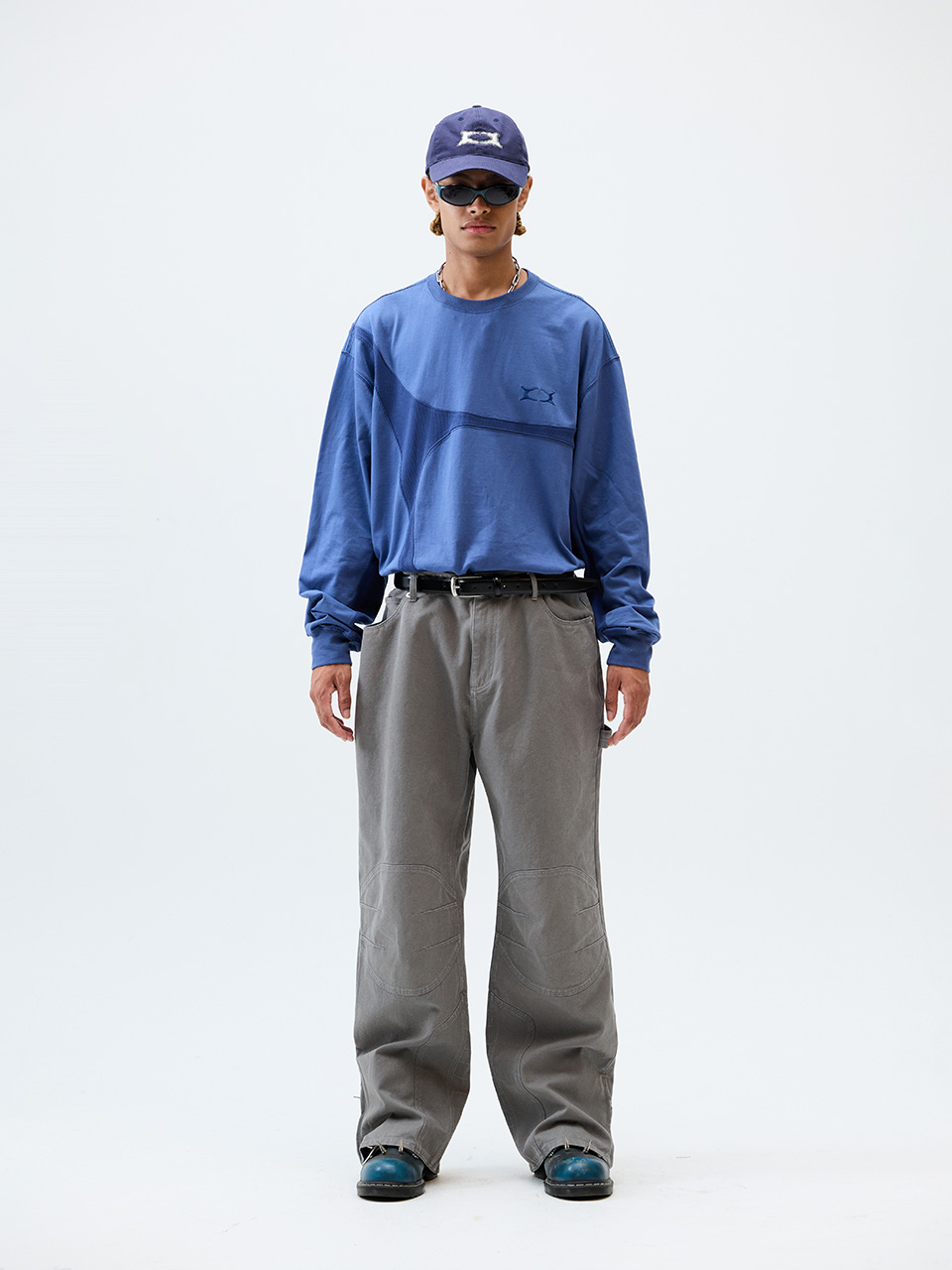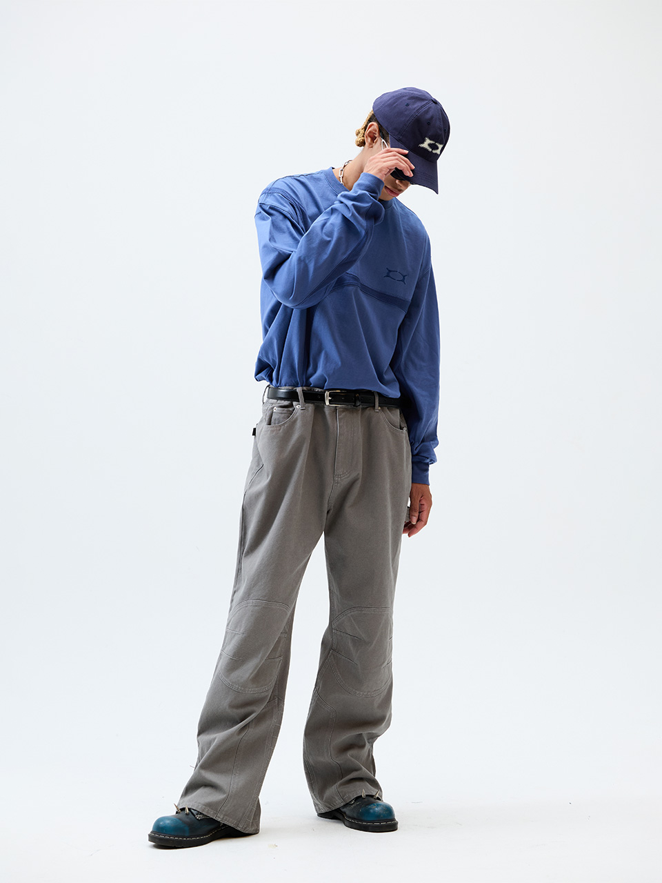 원턱 커브드 크리즈 워싱 와이드 데님 팬츠_더스트 인디고