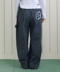 체크 플라워 와이드 팬츠 네이비