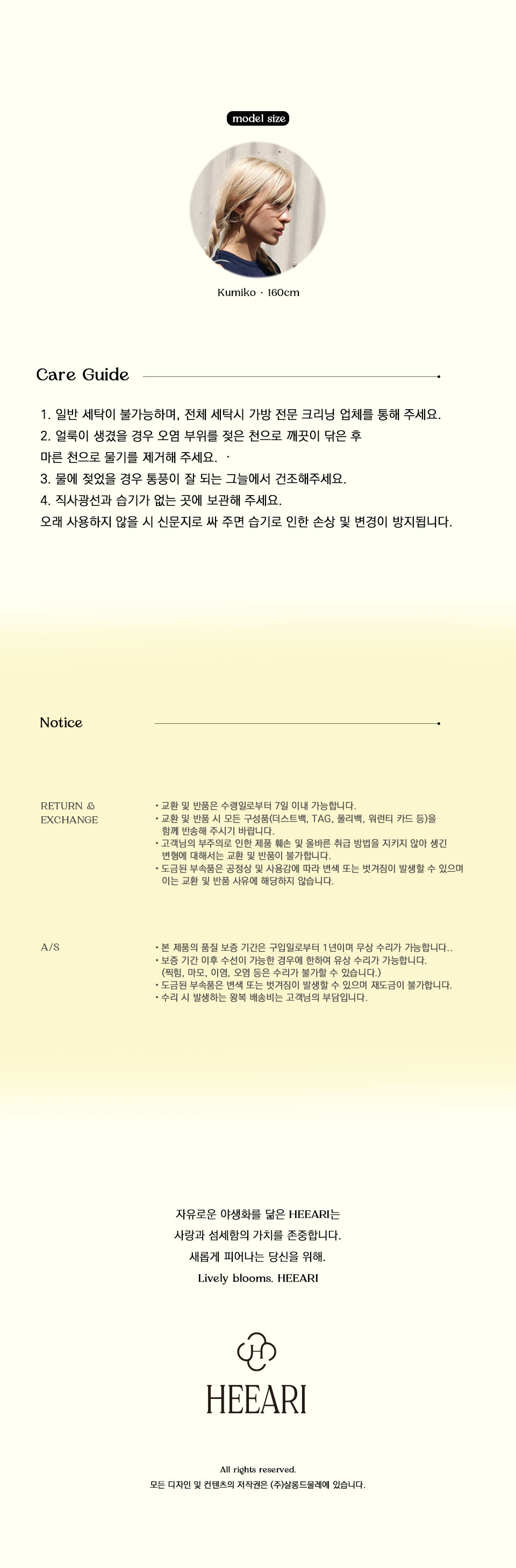 히어리(HEEARI)는 자유로운 야생화를 닮았으며, 새롭게 피어나는 당신을 위해 사랑과 섬세함의 가치를 존중합니다.