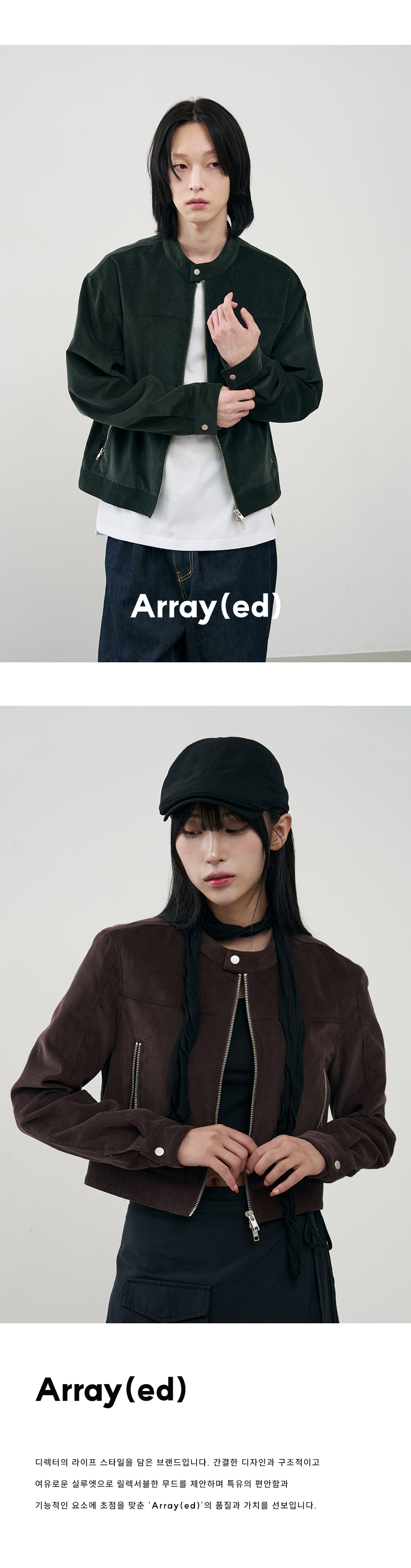 어레이드(ARRAYED)는 '특별히 멋진 옷을 입은'이라는 뜻을 기반으로 쉽게 접근할 수 있는 아이템을 재해석하여 실루엣과 디테일에 집중한 디자인을 중점적으로 전개합니다. 잘 만들어진 아이템 하나로 트렌디하고 패셔너블한 대상으로 보이게끔 하고자 합니다. 또한 '배열하다'라는 이중적 뜻을 담아 의류에만 국한된 브랜드가 아닌 라이프스타일과 뷰티 아이템 등 다양한 각도에서 모습을 보여주고자 합니다.