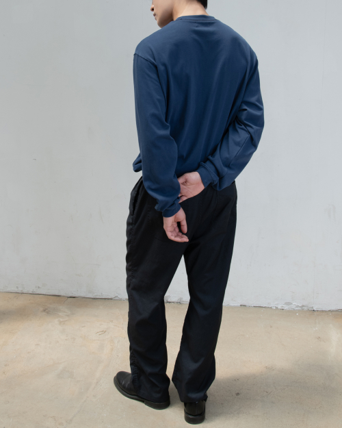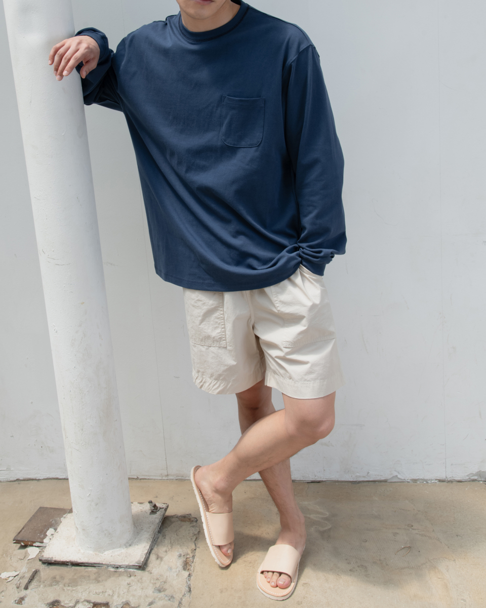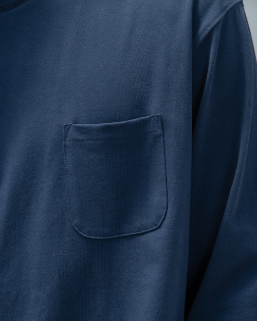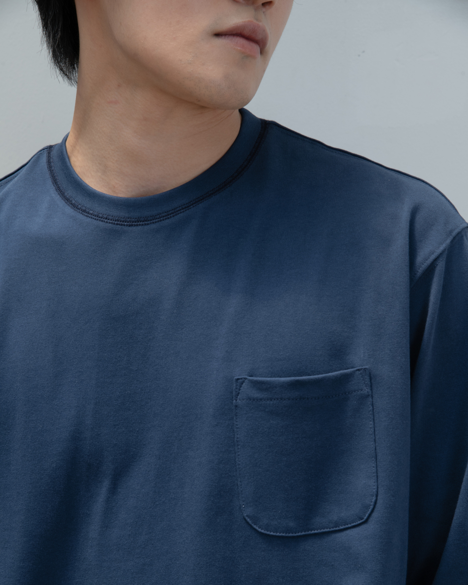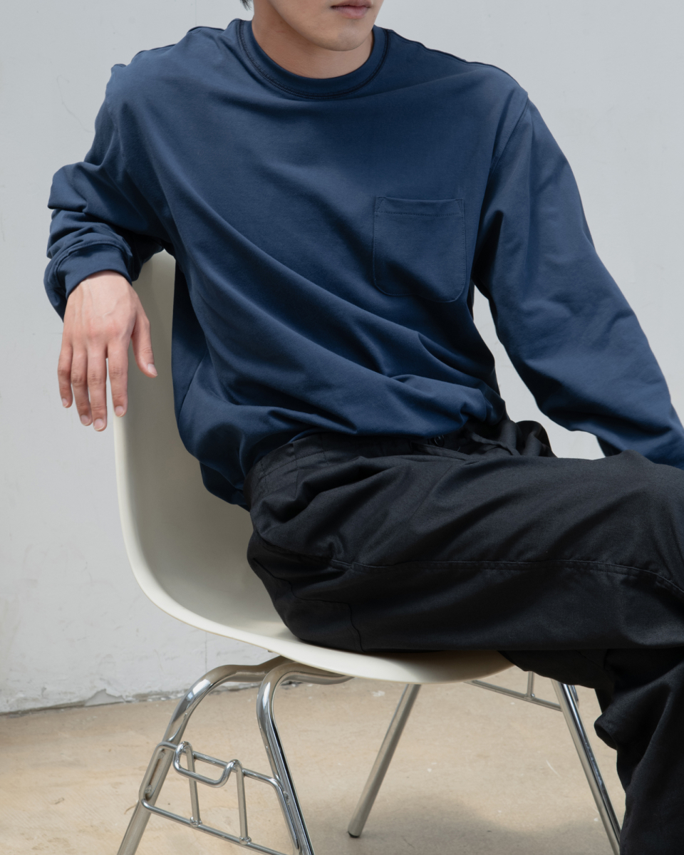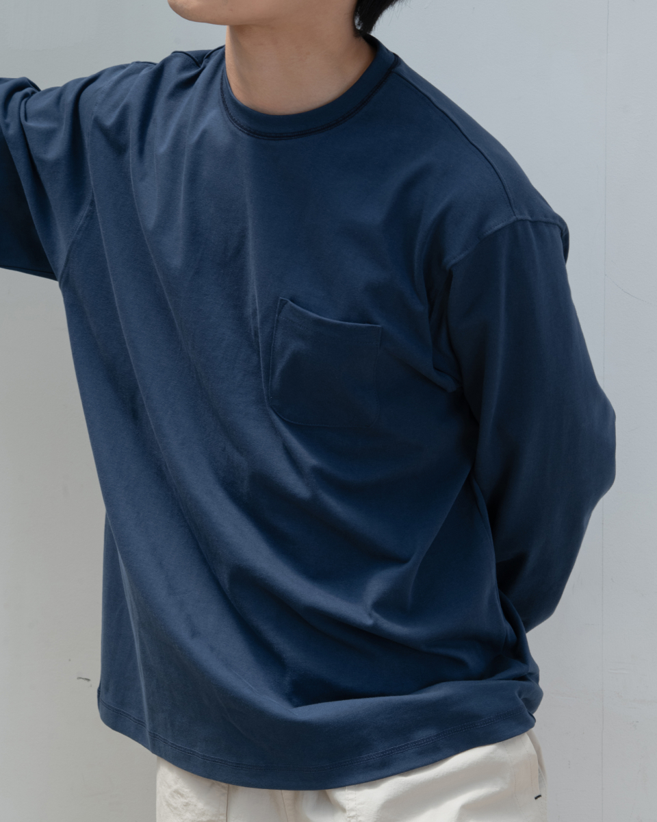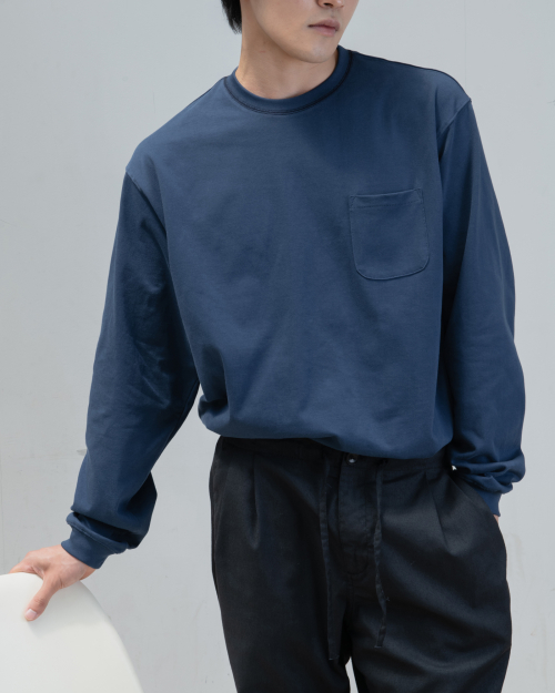 : 캐주얼한 분위기의 롱 슬리브 티셔츠 입니다. 실켓 가공으로 코튼 표면의 잔털을 제거하여 고른 외관과 부드러운 터치를 갖고 있습니다. 30수 2합의 원단으로 비침은 없이 적당히 얇은 원단이어서 사계절 내내 즐겨 입으실 수 있습니다. 넥라인에 있는 배색 3 Needle 5 Thread 커버스티치와 라운드 처리된 포켓이 특징이며, 여유있는 실루엣으로 여름에는 반바지에 연출하거나 봄, 가을에는 가벼운 아우터 이너용으로도 좋습니다. 짧고 탄탄한 소매 리브를 갖고 있으며 라인과 소매 리브 모두 바텍으로 마감하여 완성도 있고 변형이 적도록 제작했습니다.