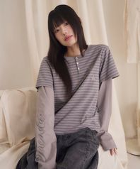 STRIPE LAYERED HENRY NECK LONG SLEEVE GRAY