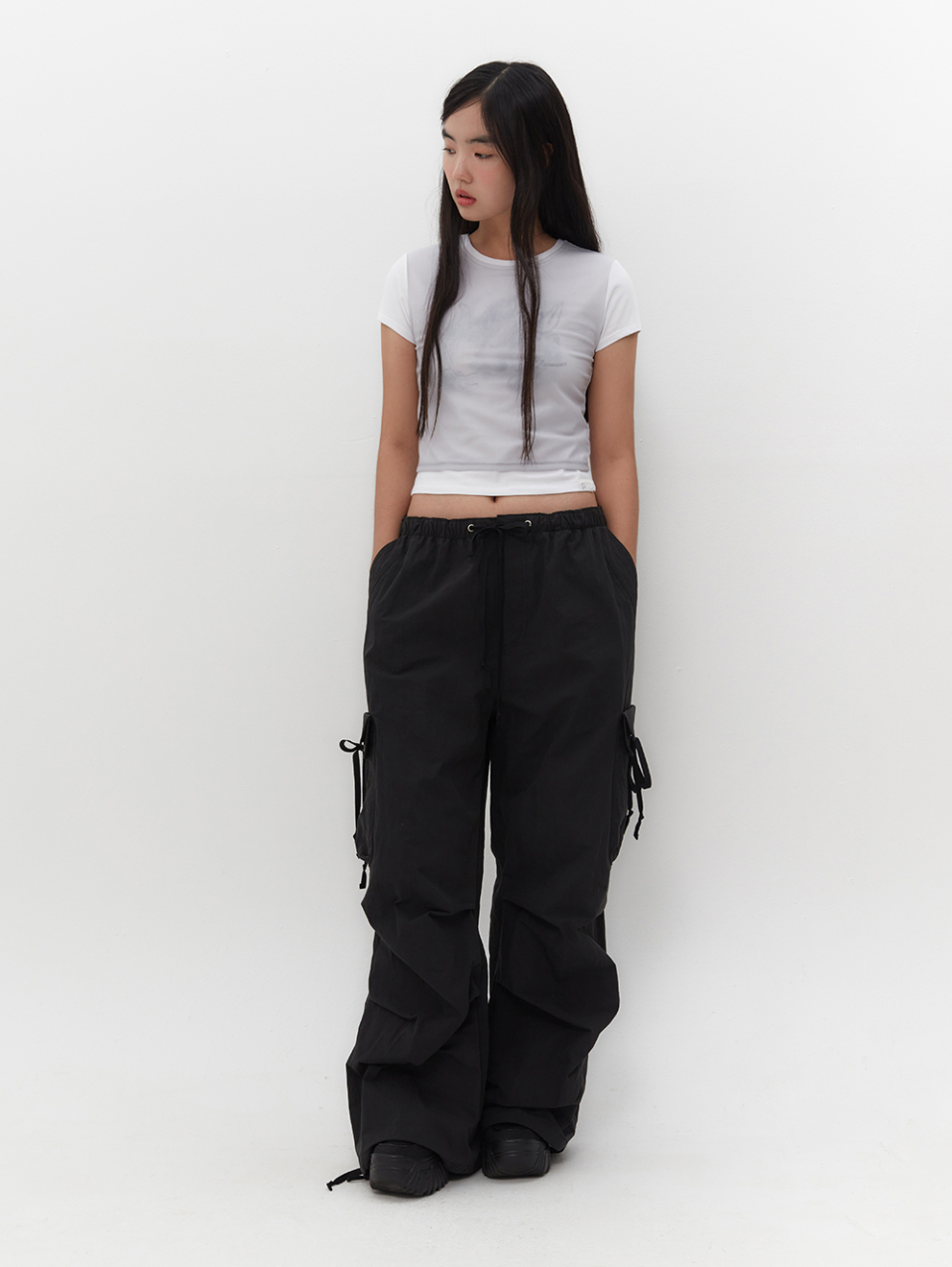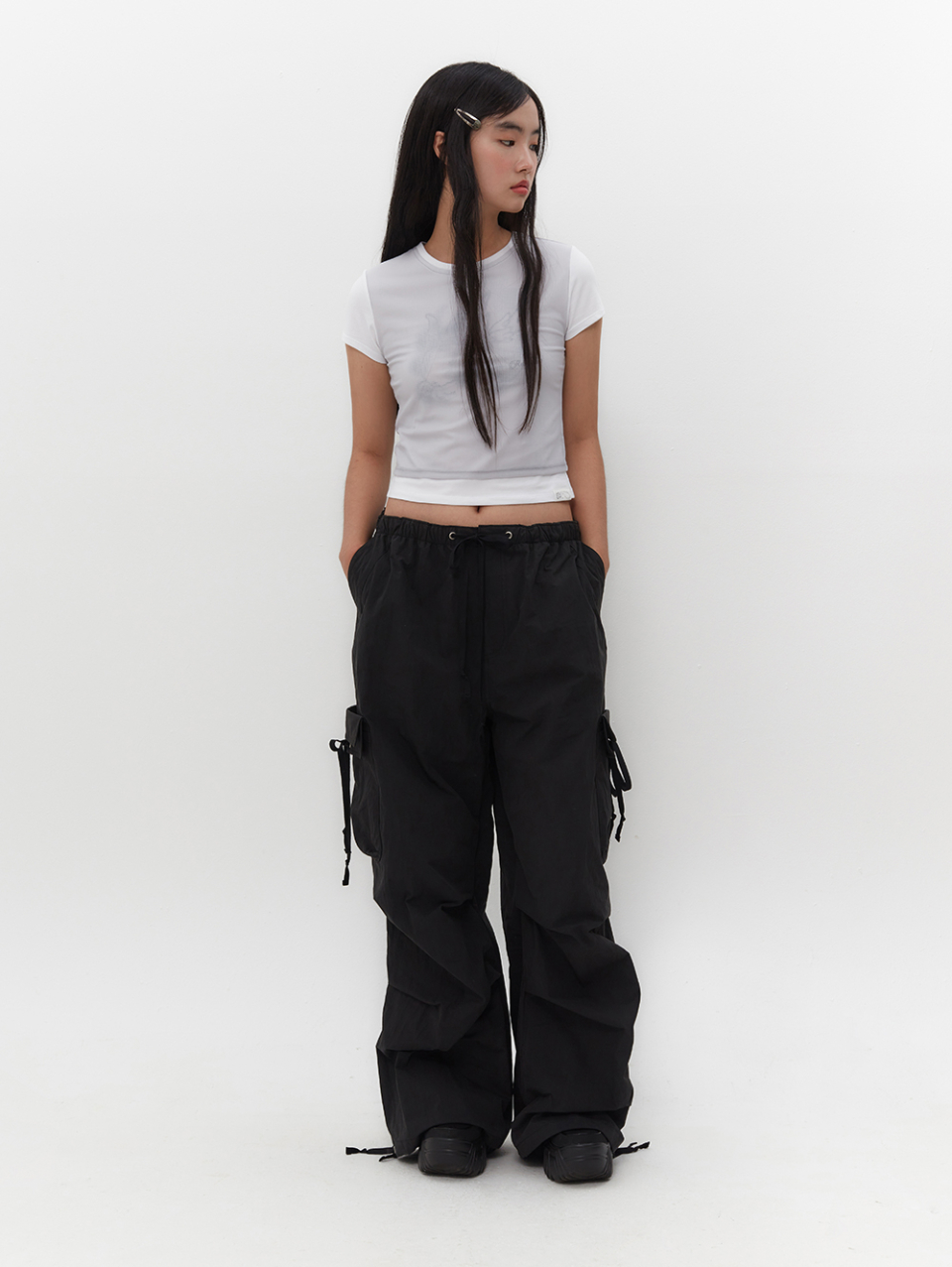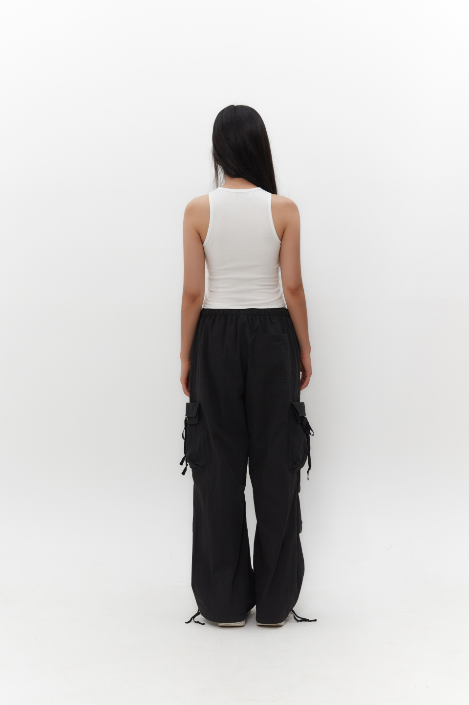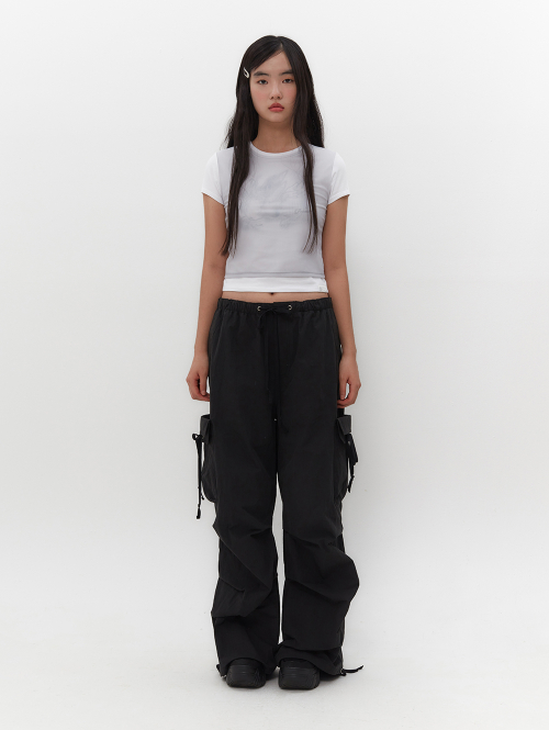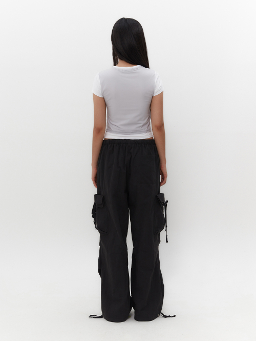 스트랩을 활용하여 허리와 밑단 핏 조절 가능