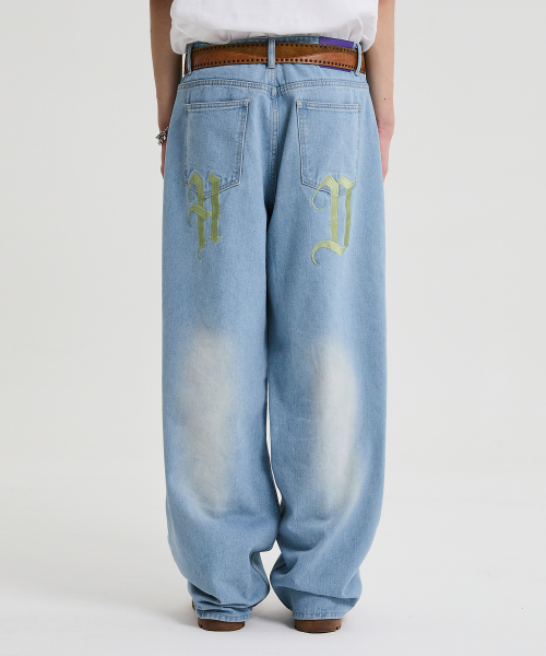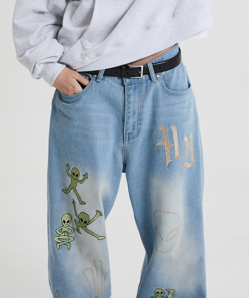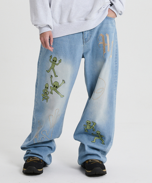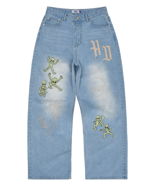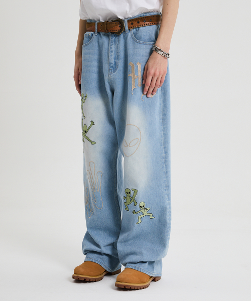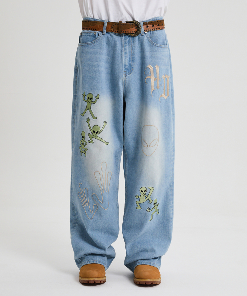 HD 에일리언 멀티 자수 데님 팬츠 라이트블루