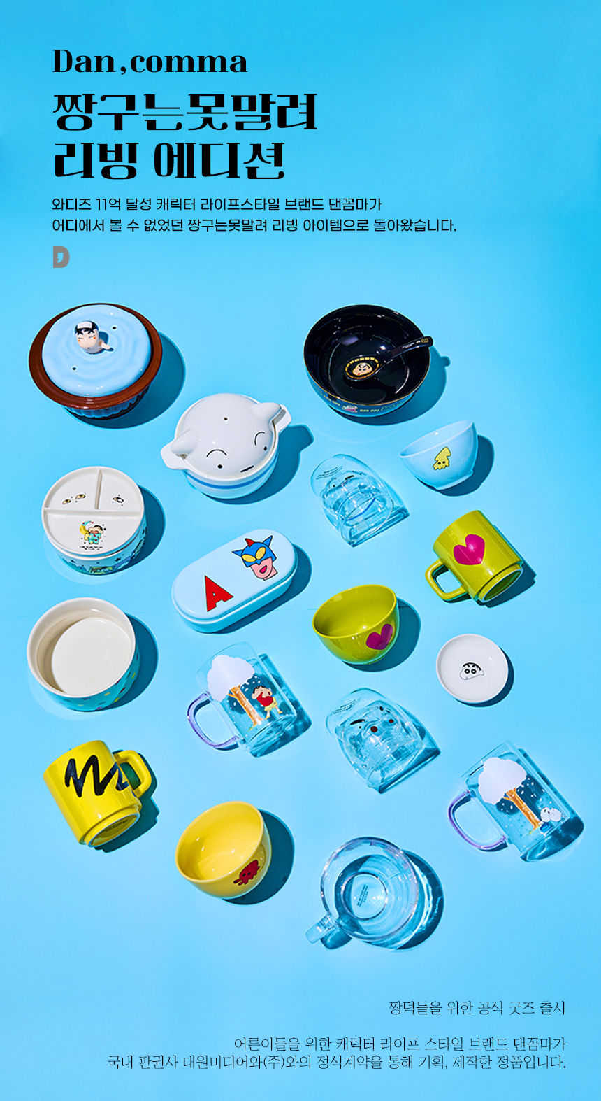 댄꼼마(DANCOMMA)는 브랜드 페르소나 캐릭터인 어른이 '댄(DAN)'의 쉼표라는 뜻으로, 어른이들을 위한 쉼표 같은 브랜드를 지향하고 있습니다. 어른이들이 좋아할 애니메이션, 캐릭터를 중심으로 다양한 라이프스타일 아이템을 전개합니다.