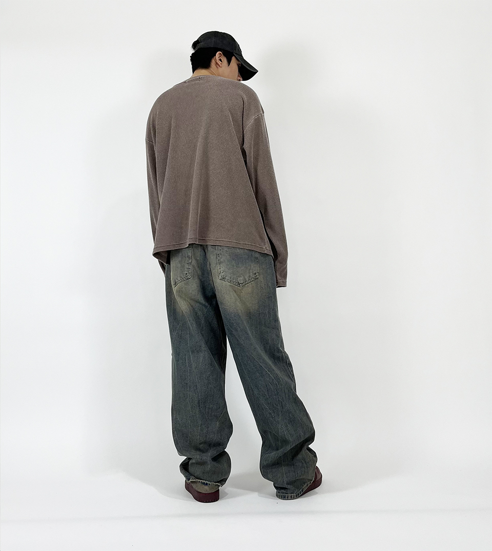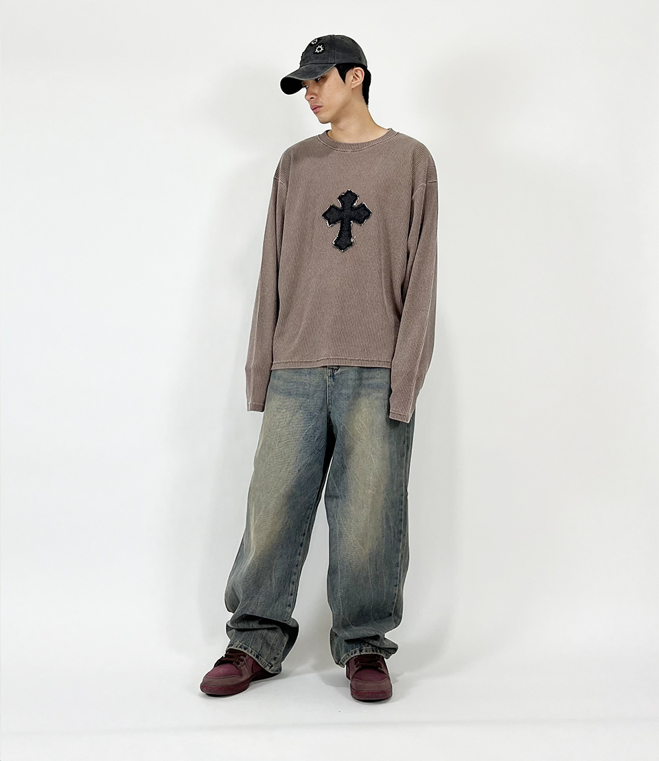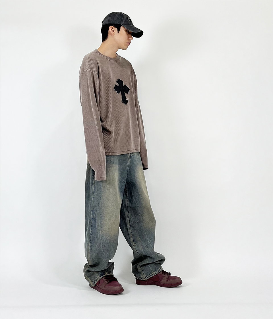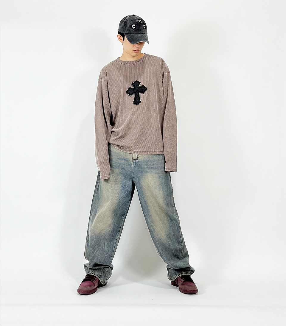 스팽글 스타 그래픽 내추럴 워시드 벌룬 와이드핏 데님 팬츠 [흑청]