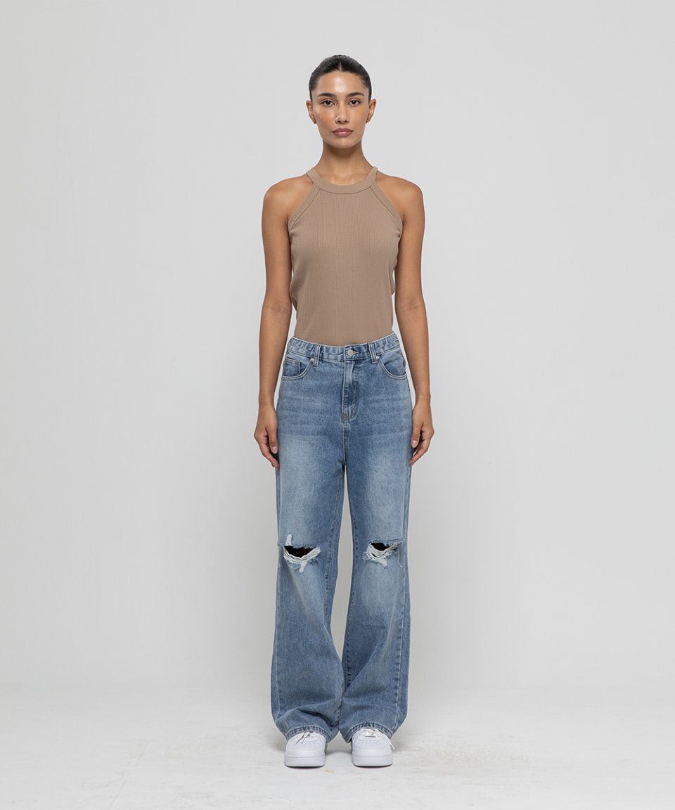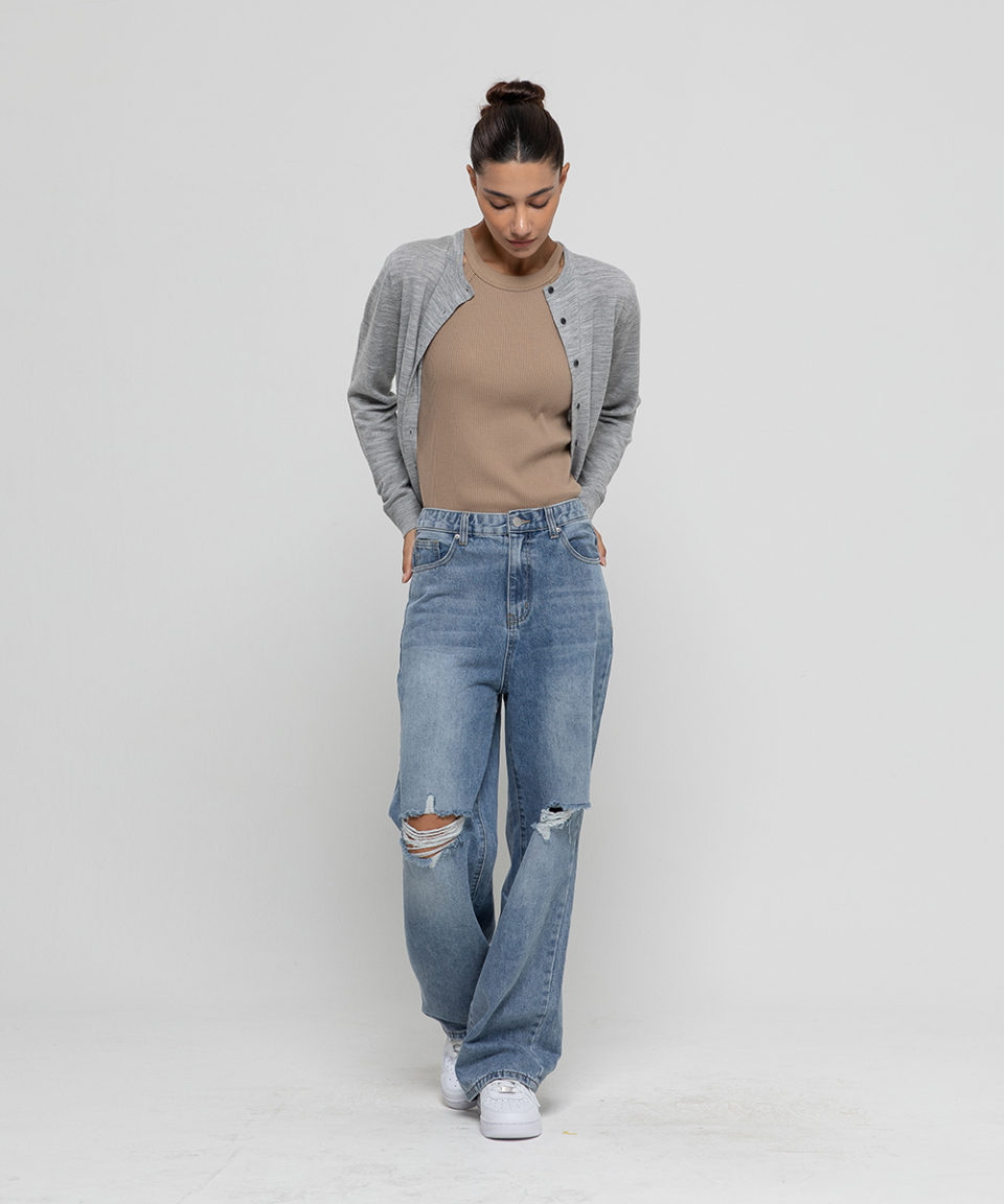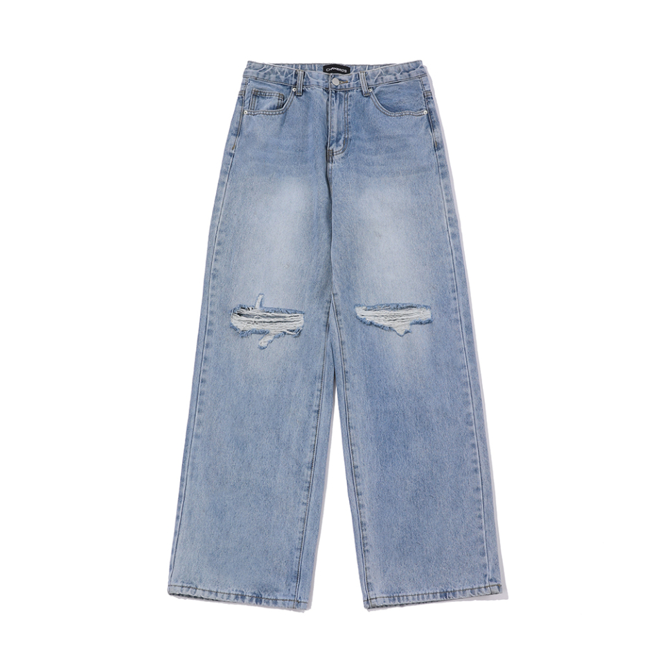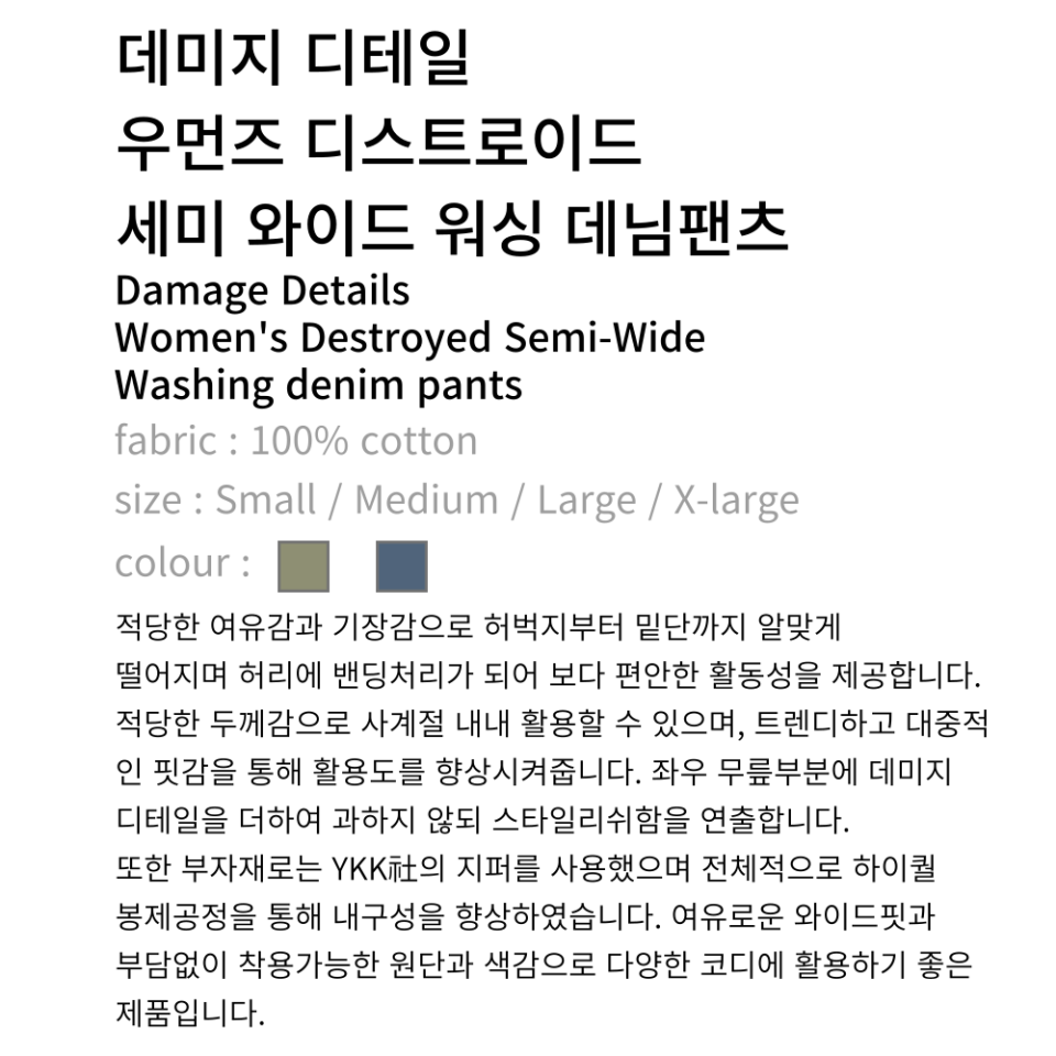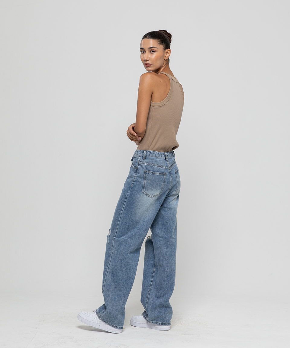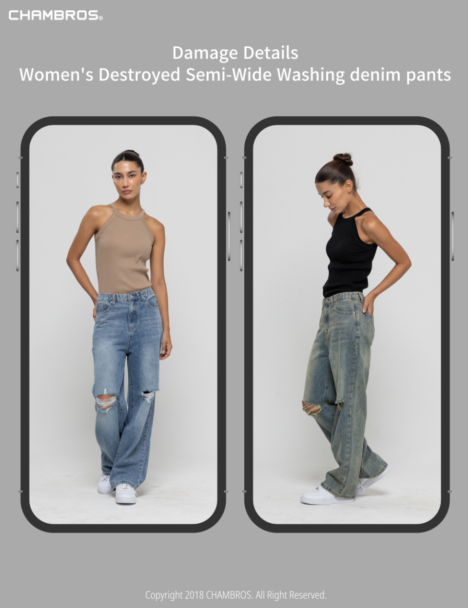 우먼즈 디스트로이드 세미 와이드 워싱 데님팬츠[라이트블루]