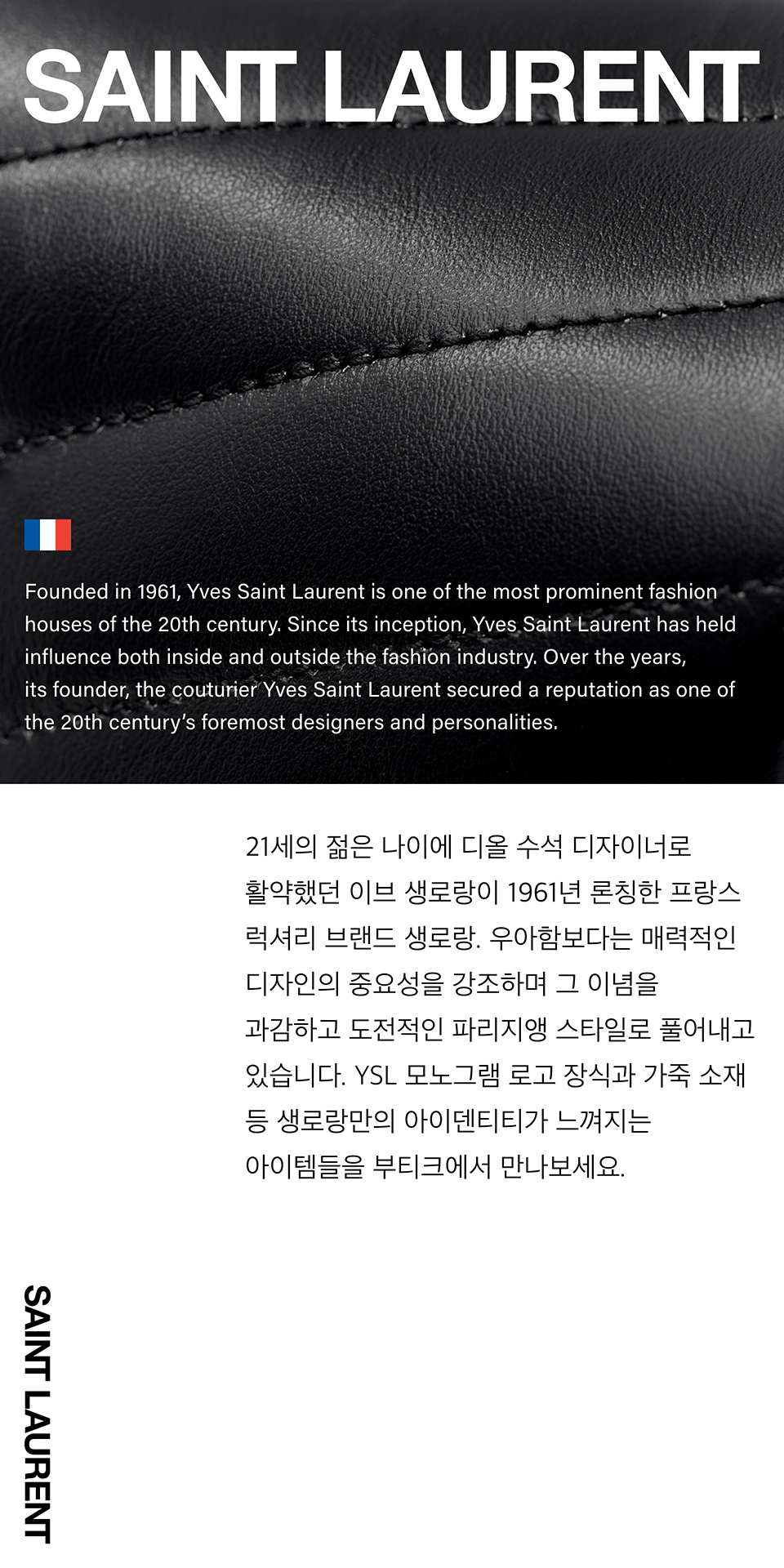 SAINT LAURENT(생로랑)은 1961년 런칭하였으며, 런칭 당시 패션의 젊은 스트리트 감성을 도입했습니다.미니멀하고, 컨템퍼리리한 지향점을 상직적으로 추구하고있는 브랜드입니다.