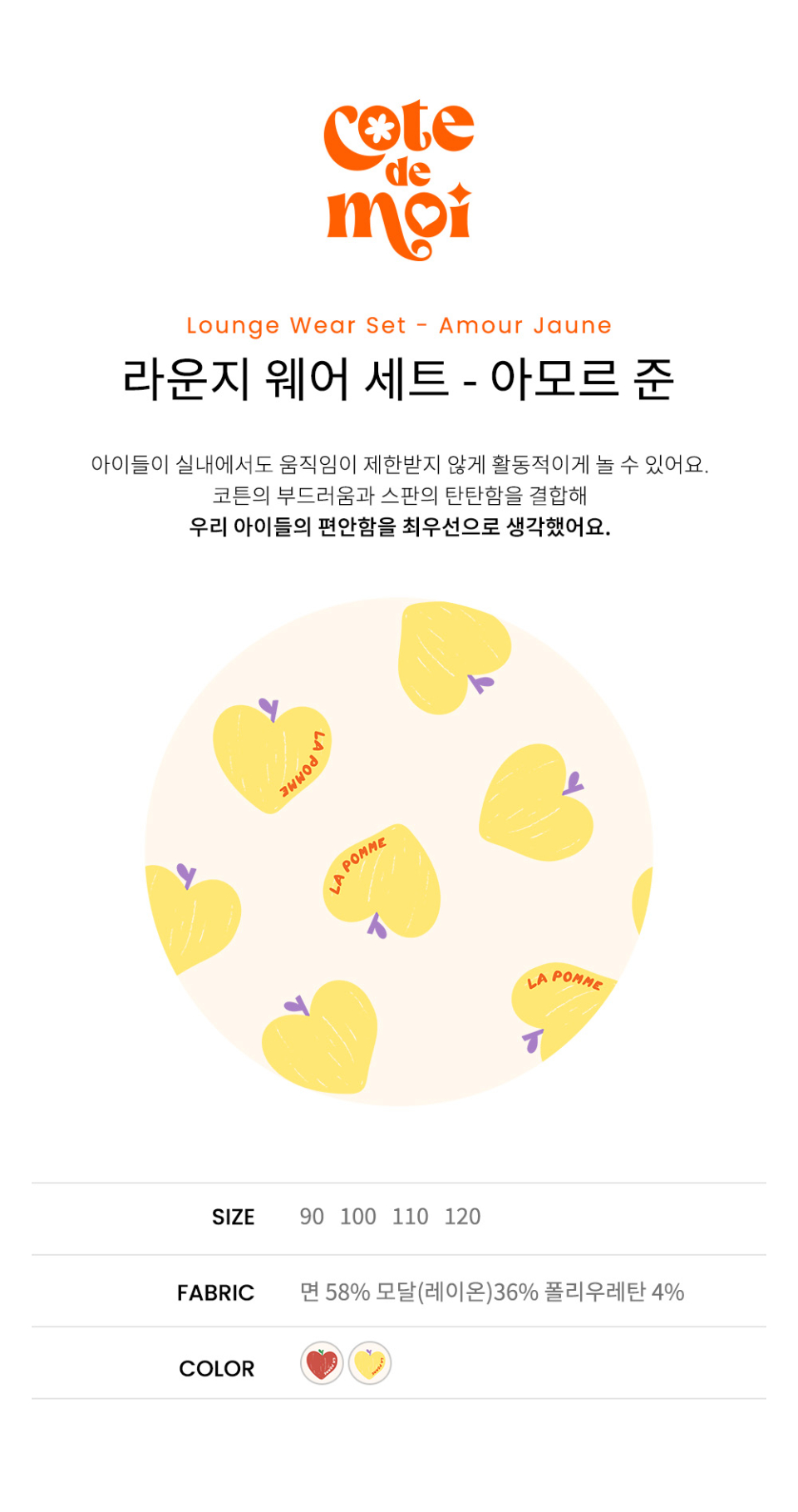 꼬떼드무어(COTE DE MOI)는 '내 옆에'라는 뜻을 담고 있습니다. 아이들과의 모든 순간을 함께하고자 하는 마음을 담아 디자인한 브랜드입니다.