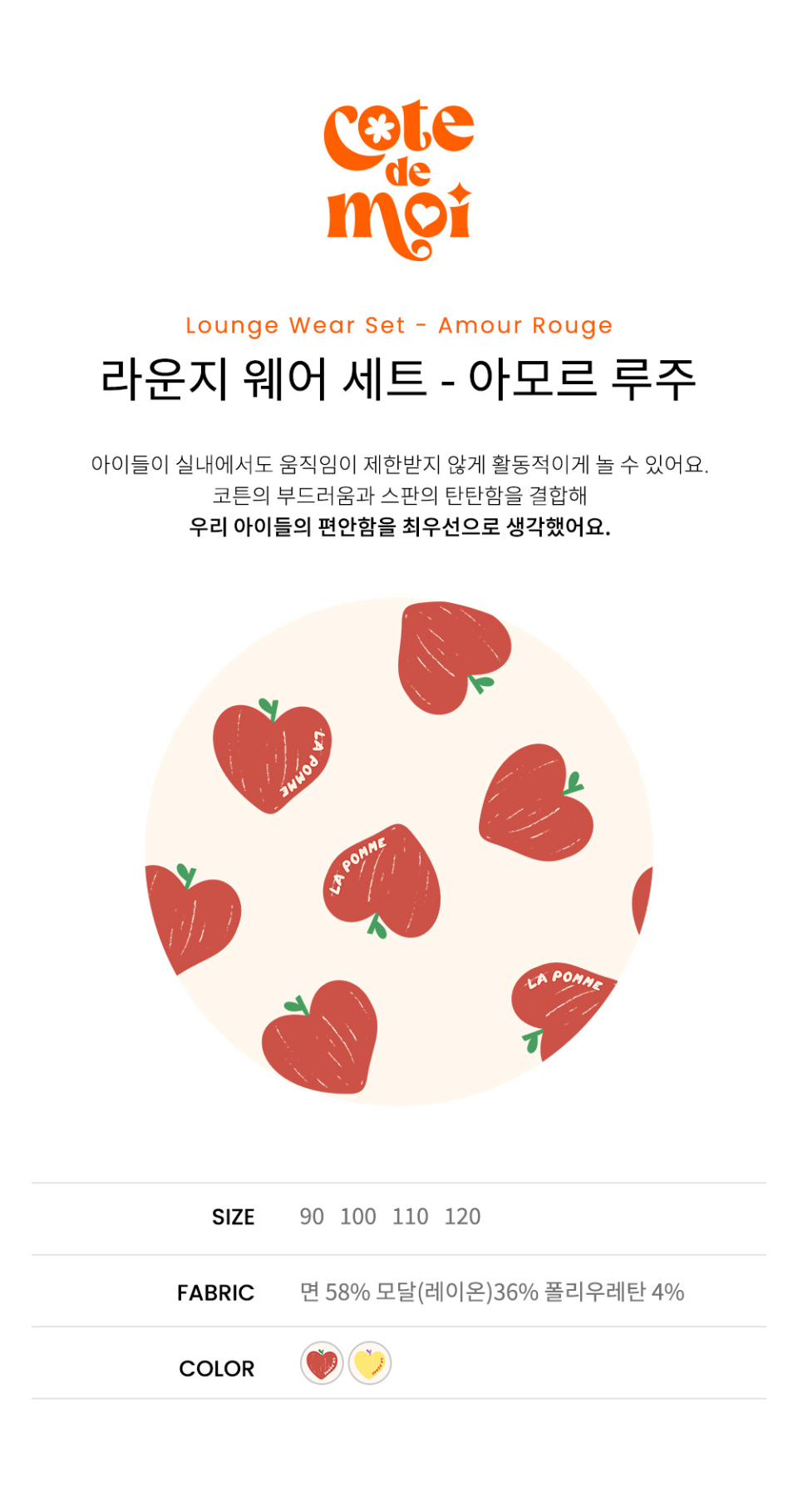 꼬떼드무어(COTE DE MOI)는 '내 옆에'라는 뜻을 담고 있습니다. 아이들과의 모든 순간을 함께하고자 하는 마음을 담아 디자인한 브랜드입니다.