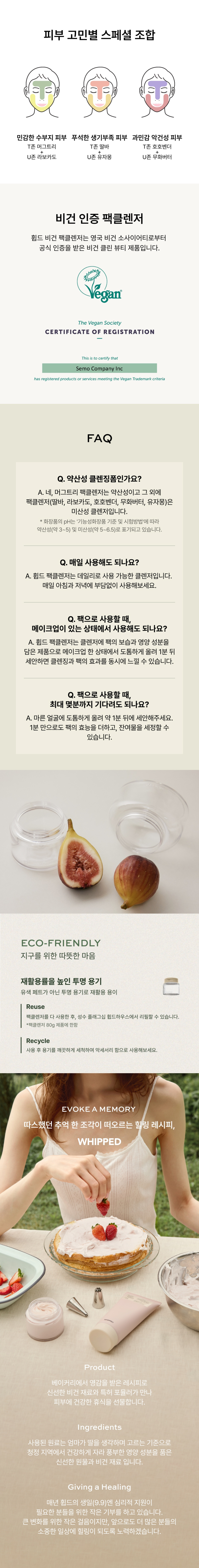 휩드(WHIPPED)는 생일날 엄마가 딸을 생각하며 고른 신선한 재료들로 정성 가득 만들어주신 생일 케이크에서 영감을 받아 탄생한 비건 스킨케어 브랜드입니다. 베이커리에서 영감을 받은 레시피로 100% 비건 재료와 특허 포뮬러가 만나 피부에 건강한 휴식을 선물합니다.