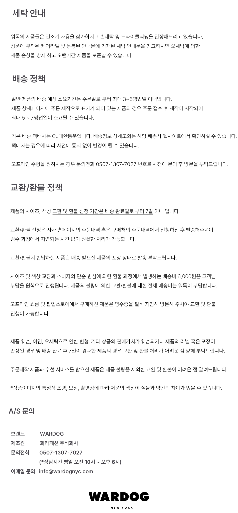 워독(WARDOG)은 뉴욕 펜스테이션의 군견에서 영감을 받아 다채롭고 생동감 넘치는 뉴욕 스트릿 패션을 담아낸 브랜드입니다. 감성적이면서도 힙한 스타일을 추구하며, 비비드한 컬러로 뉴욕의 활기찬 모습을 표현합니다. 워독은 기본에 충실한 클래식한 디자인과 함께 웨어러블하고 편안한 착용감과 뛰어난 핏을 자랑하는 제품만을 생산합니다.