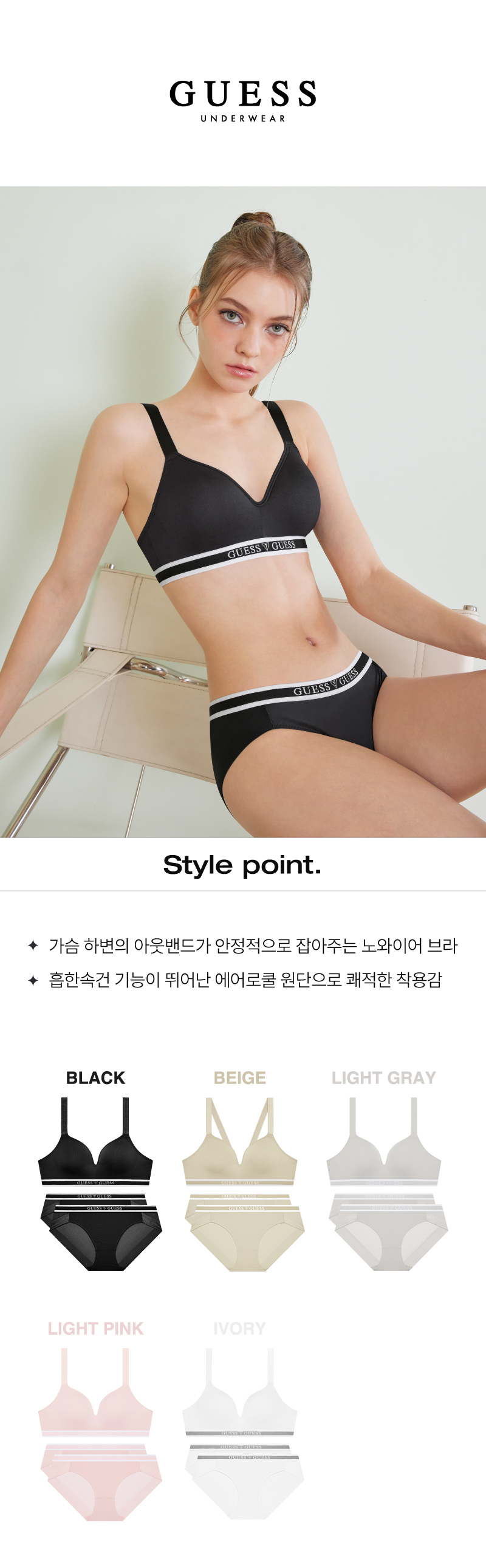 게스 언더웨어(GUESS UNDERWEAR)는 게스(GUESS)의 디자인에 한국인 체형에 맞춘 테크놀로지를 개발, 결합하여 뛰어난 품질의 언더웨어를 합리적인 가격에 제시합니다.