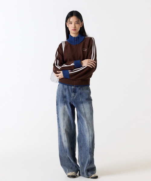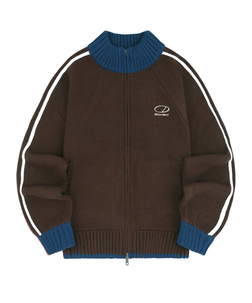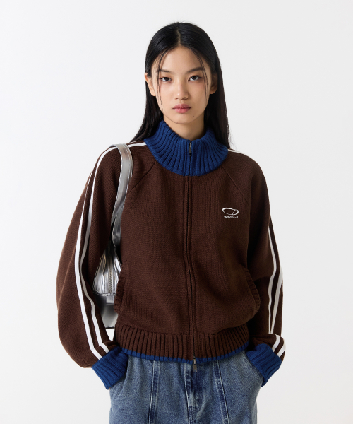 스포티 트랙 세미 크롭 니트 집업 - BROWN
