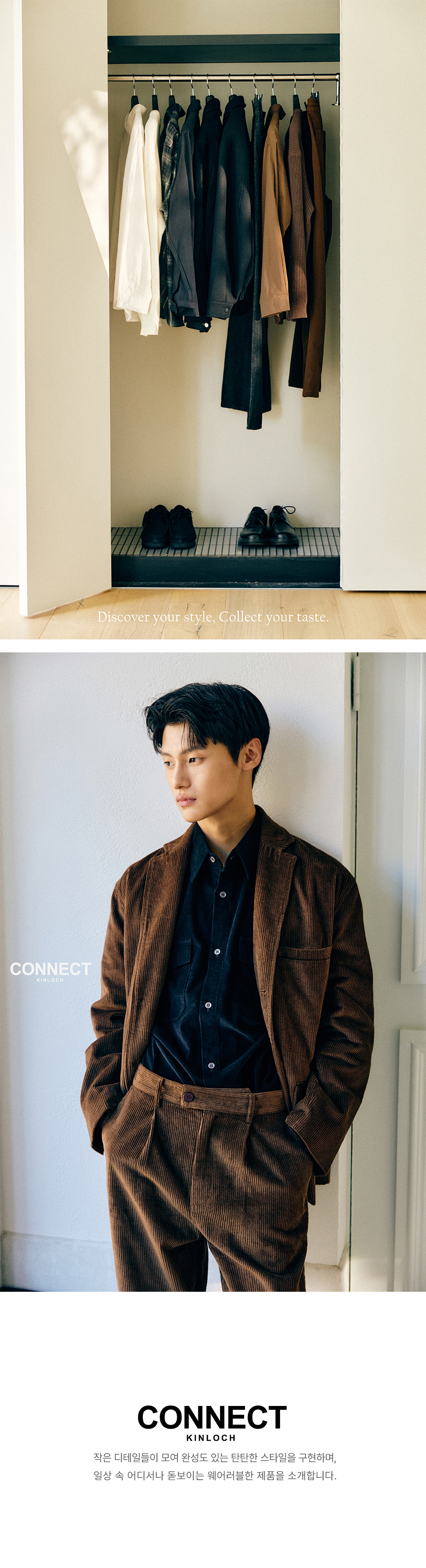 커넥트킨록(CONNECT KINLOCH)은 전통적인 남성복의 구조와 품격을 바탕으로, 현대적인 감성과 실용성을 더한 웨어러블웨어를 전개하는 브랜드입니다. 균형 잡힌 실루엣과 섬세한 디테일을 통해 일상 속에서 자연스럽게 스며드는 옷을 만듭니다. 익숙함 속의 새로움, 단정함 속의 자유로움을 담아, 지금 우리의 삶에 어울리는 클래식을 제안합니다.