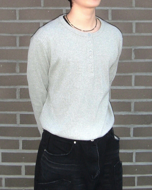 리브드 스냅 헨리넥 크롭 티셔츠 [멜란지그레이]