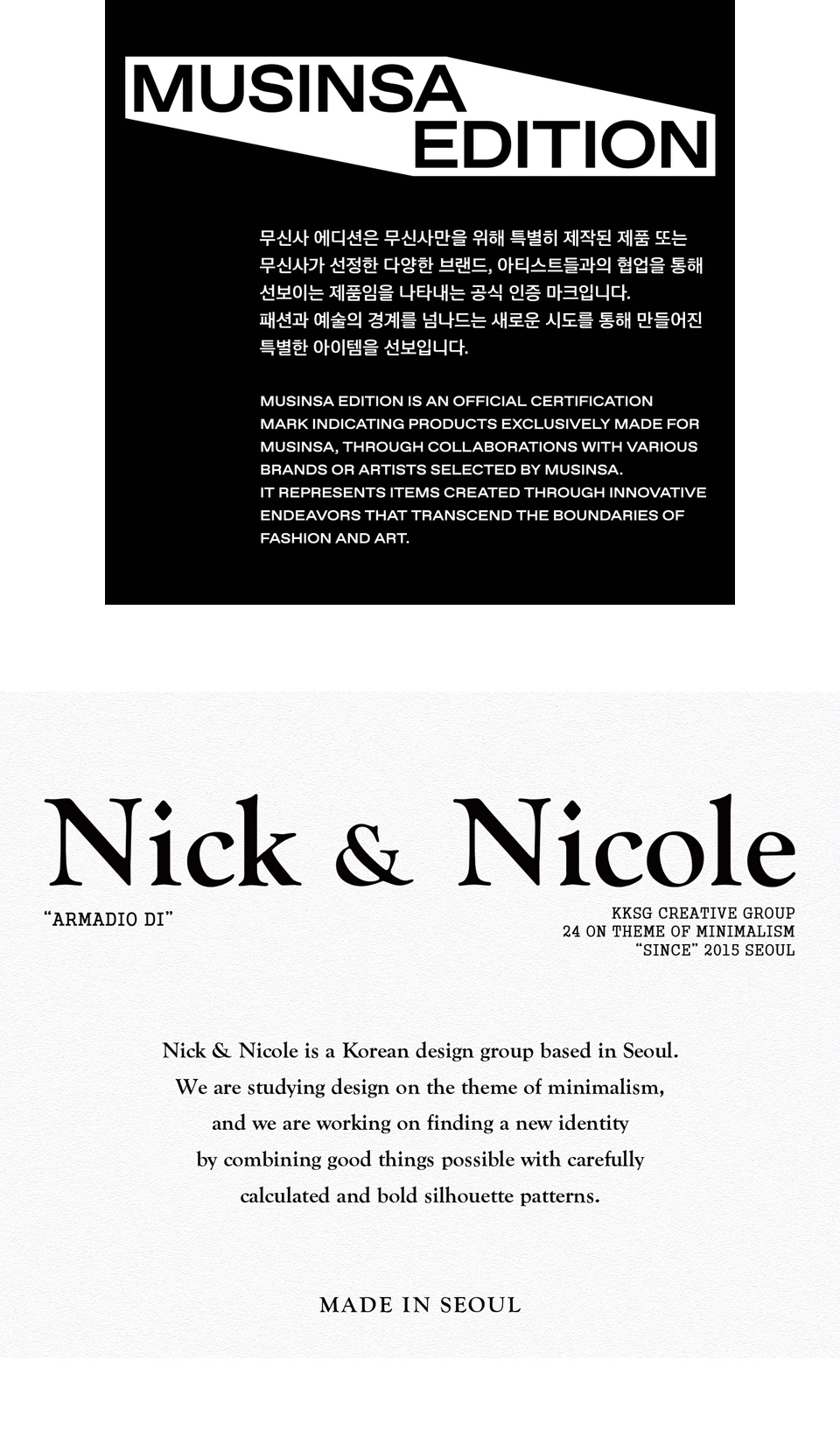 닉앤니콜(NICK&NICOLE)은 웨어러블한 아이템을 바탕으로 흥미로운 디테일과 위트가 있는 실루엣으로 미니멀리즘을 추구하며 컨템포러리 하게 표현하고자 하는 브랜드입니다. 닉앤니콜의 디자인은 옷에만 경계를 두지 않고 일상생활 속 다양한 아이템에서도 접할 수 있습니다. 매 시즌 새로운 컨셉과 스토리로 전개하며 기본을 지키되 닉앤니콜만의 특별함을 잃지 않는 것을 목표로 합니다.