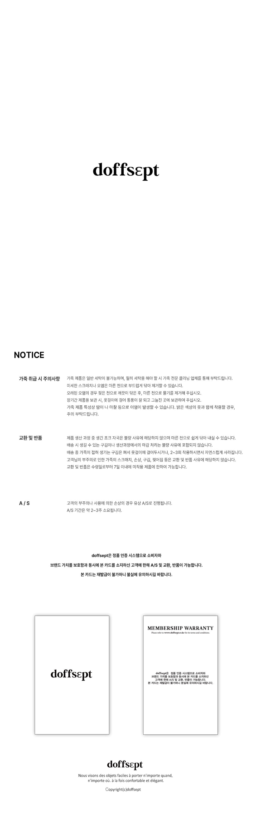 도프셉(DOFFSEPT)은 언제 어디서나 가볍게 착용하기 좋은 레더 아이템을 지향하는 여성 레더 브랜드입니다. 트렌디하면서도 레더 특유의 시크함을 바탕으로 베이식하고 고급스러우면서도 높은 접근성을 제안합니다.
