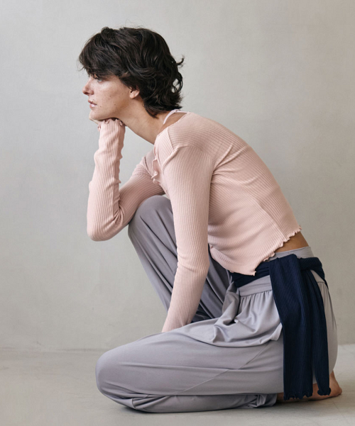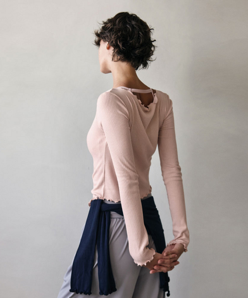 여성 요가복 DEVI-T0112-살몬핑크 필라테스 웨이븐 프릴 롱슬리브