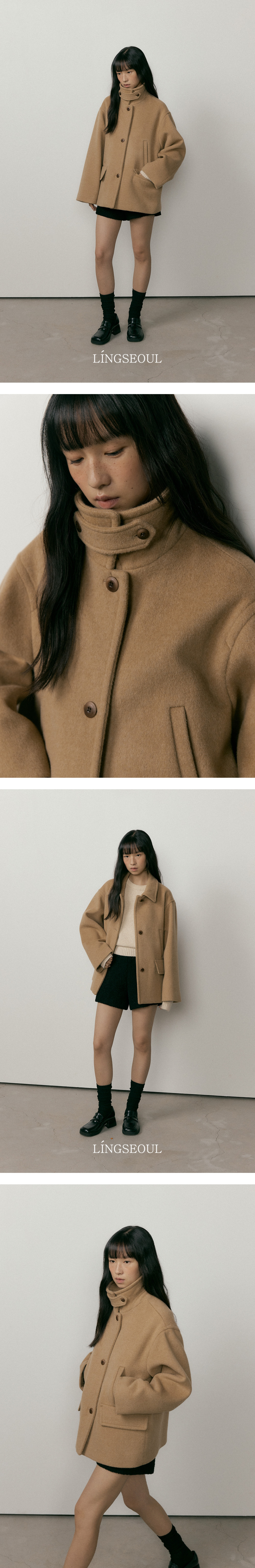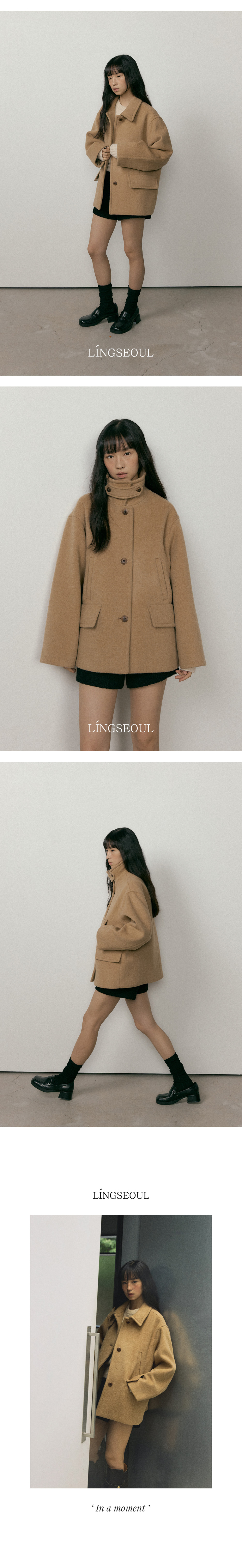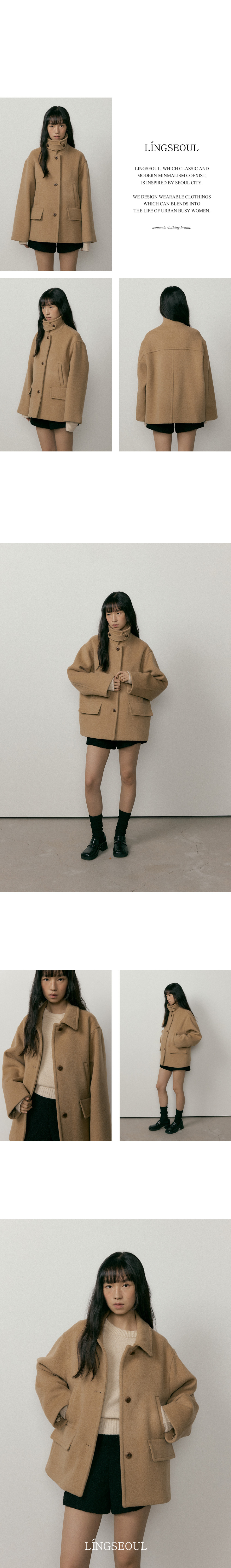 이중직 메리노울 소재를 사용한 힙을 살짝 덮는 하프 기장의 세미 오버핏 코트입니다. 넥 부분 패널로 2 Way 연출이 가능한 디자인입니다. 실사용 가능한 양 사이드 더블 포켓 포인트 디테일과 이너 포켓으로 수납력을 더해주었습니다. 안감이 있어서 이너와의 마찰 없이 부드럽고 따뜻하게 착용할 수 있습니다.