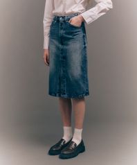 (W) 마라디 데님 미디 스커트 크링클 워시드 블루