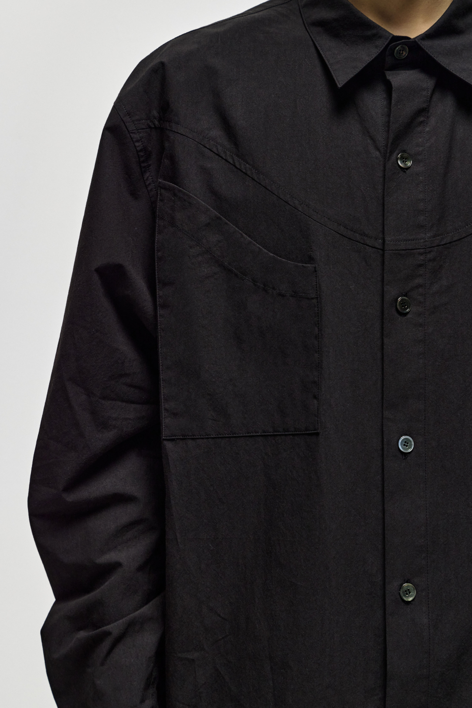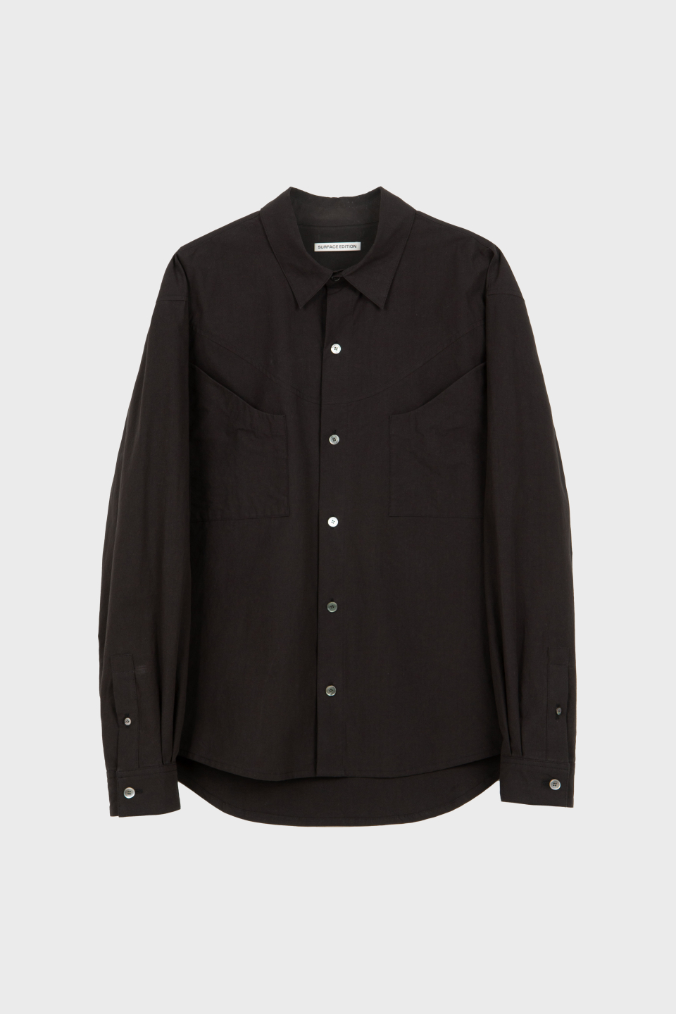 전면부에 위치한 곡선 형태의 포켓 디테일이 있으며, 고급스러운 자개단추 부자재로 마무리하였습니다.
