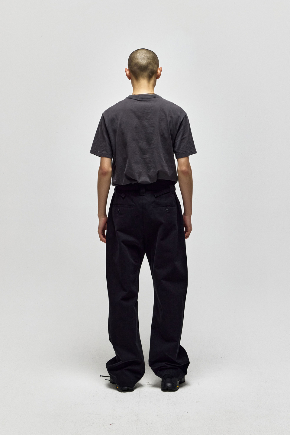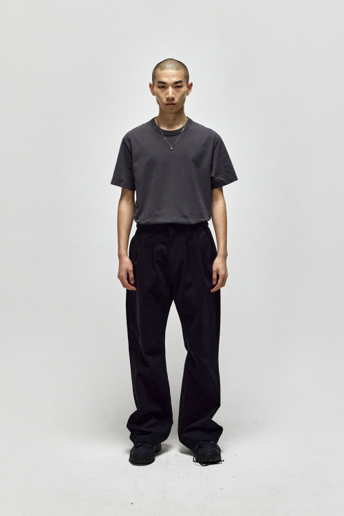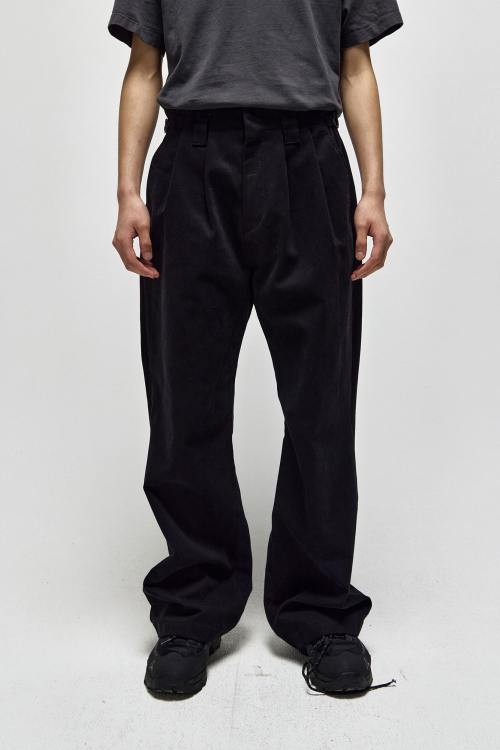 피치 가공된 견고한 텍스쳐가 돋보이며, 전면부에 위치한 두개의 턱과 인심의 다트 디테일로