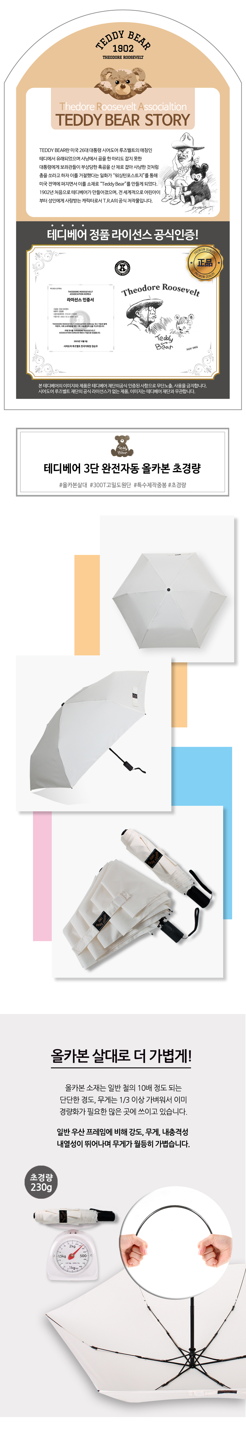 테디베어 53 6K 카본 300T 초고밀도 경량 3단 자동우산 세이프폴딩 아이보리
