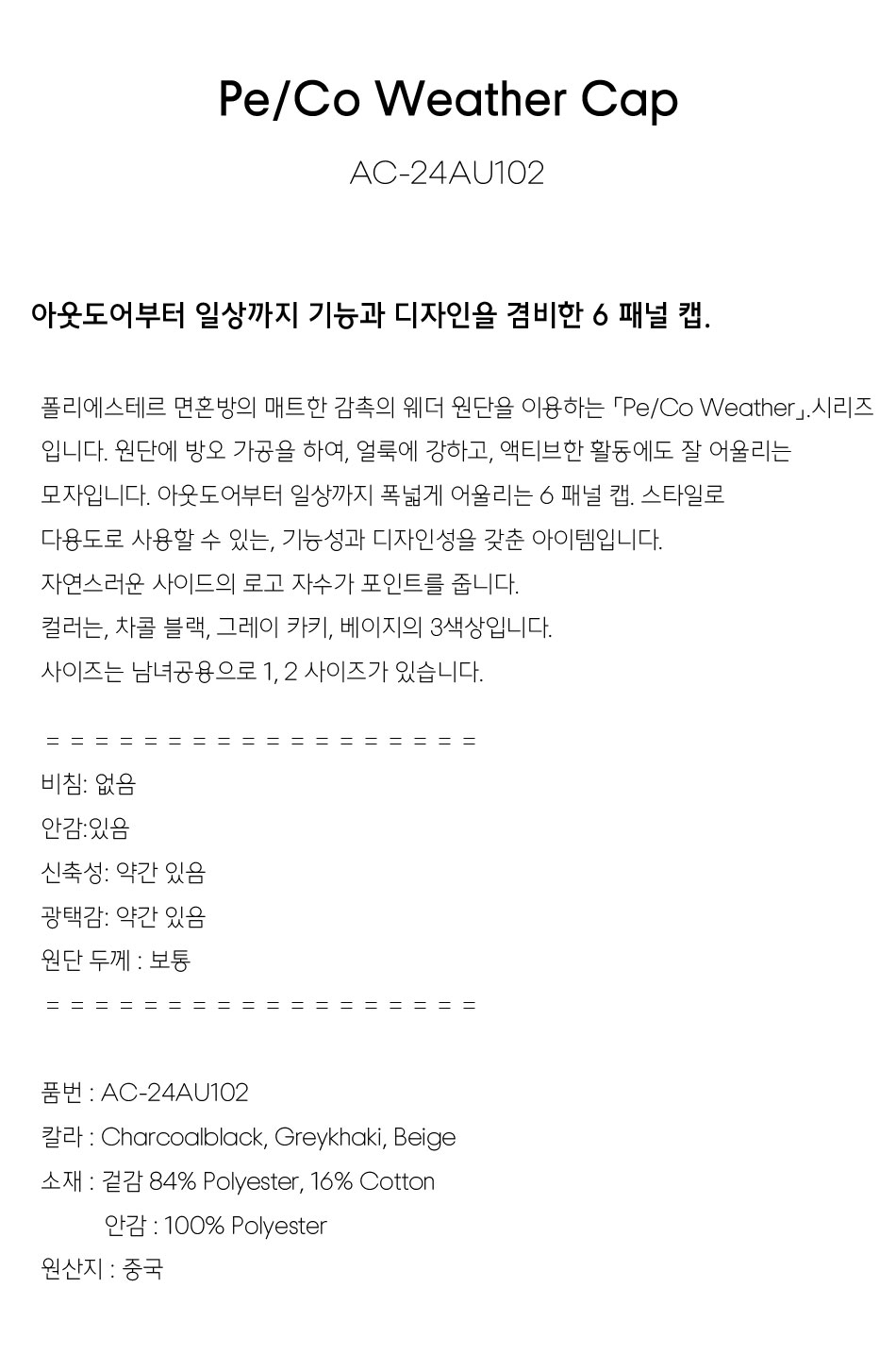 Pe/Co 웨더 캡 - 차콜블랙 / AC-24AU102CBK